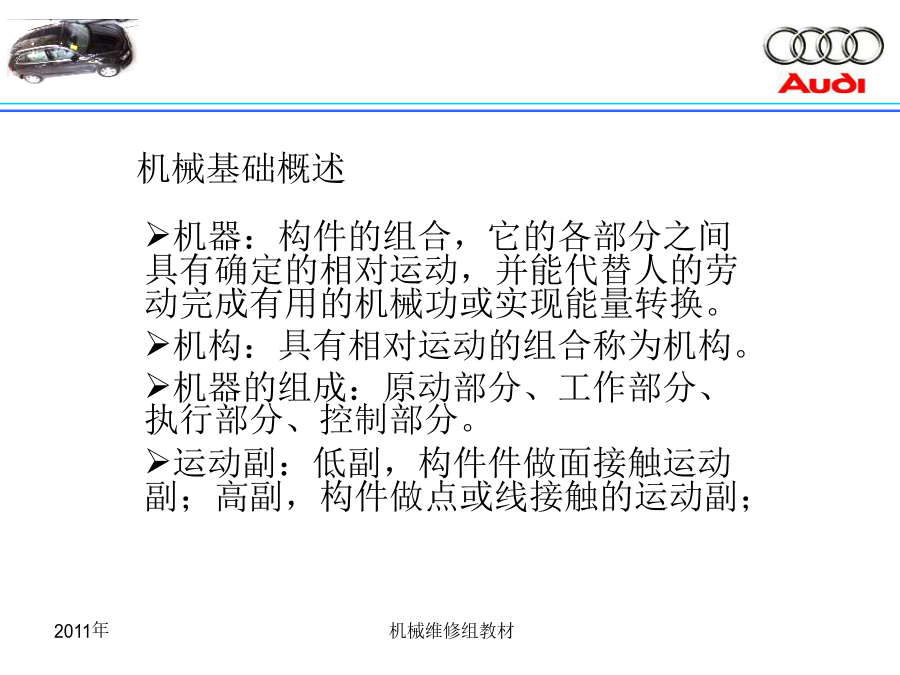 机械安全知识培训MechanicalSafetyTraining概述机械系统的优点机械系统的优点主题介绍主题介绍机械的使用功能(一)机械设备产生的危险机械危险的形式工伤死亡事故在珠三角的企业,每年发生断指事故个案至少有3万宗以上,被机器切断的手指头约超过4万只;浙江的义乌和东莞清溪镇既是“五金之乡”也是断指之乡。由于人的安全素质差(即安全意识差、安全观念差、安全技能差、安全行为规范差)而造成的事故灾祸占伤亡事故的80%以上。工伤死亡事故教训工伤死亡事故教训机械安全培训主要目录第三部分:焊接安全(p155-