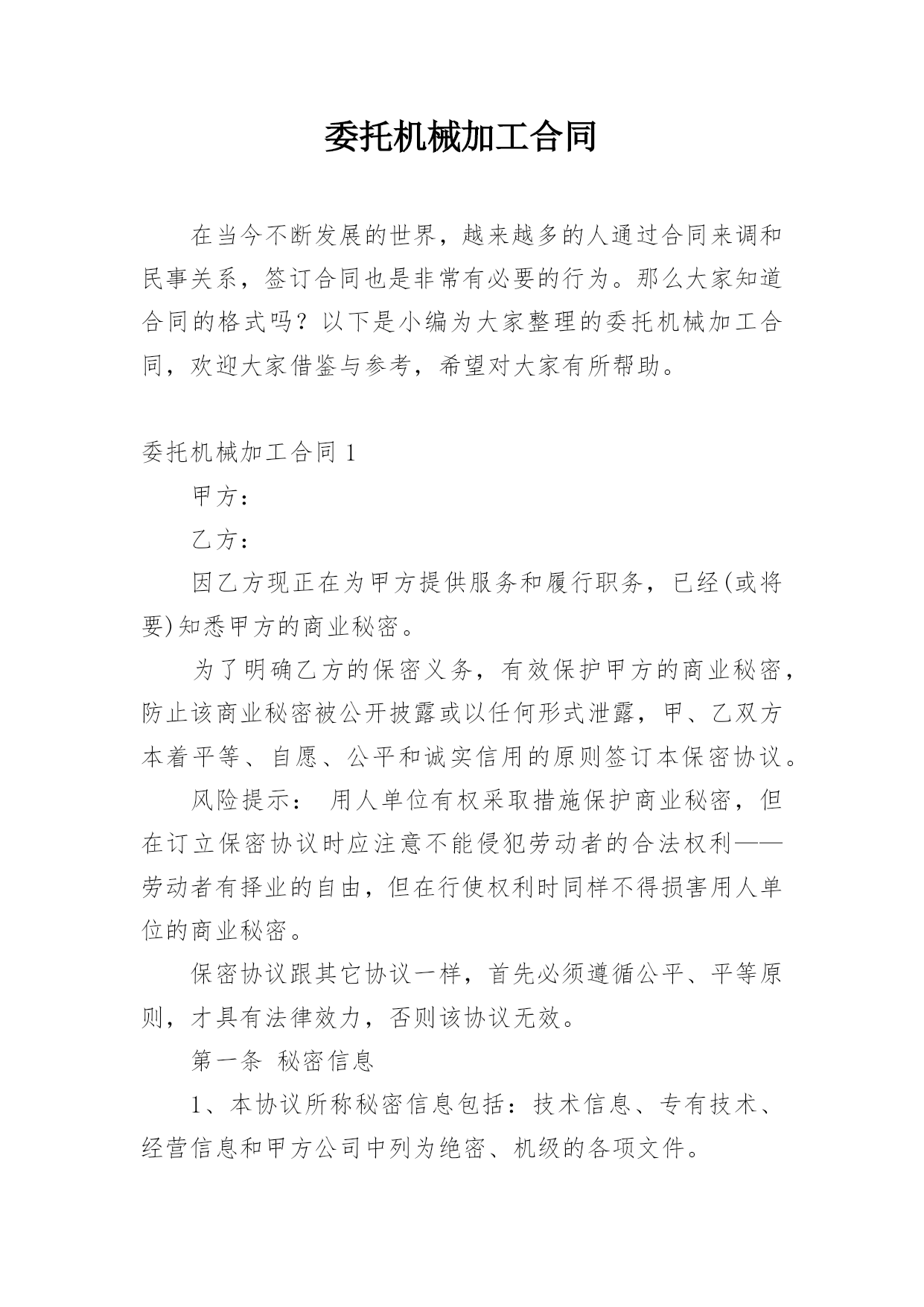 委托机械加工合同在当今不断发展的世界,越来越多的人通过合同来调和民事关系,签订合同也是非常有必要的行为。那么大家知道合同的格式吗?以下是小编为大家整理的委托机械加工合同,欢迎大家借鉴与参考,希望对大家有所帮助。委托机械加工合同1甲方:乙方:因乙方现正在为甲方提供服务和履行职务,已经(或将要)知悉甲方的商业秘密。为了明确乙方的保密义务,有效保护甲方的商业秘密,防止该商业秘密被公开披露或以任何形式泄露,甲、乙双方本着平等、自愿、公平和诚实信用的原则签订本保密协议。风险提示:用人单位有权采取措施保护商业秘密,但