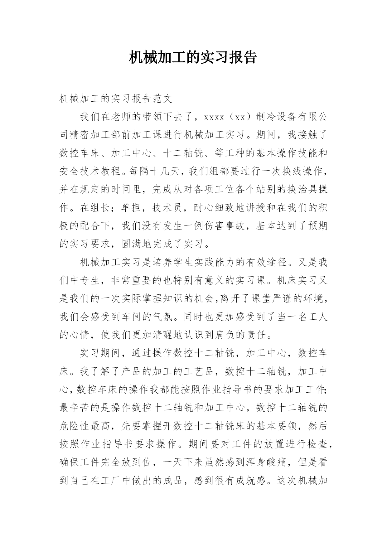 机械加工的实习报告机械加工的实习报告范文我们在老师的带领下去了,xxxx(xx)制冷设备有限公司精密加工部前加工课进行机械加工实习。期间,我接触了数控车床、加工中心、十二轴铣、等工种的基本操作技能和安全技术教程。每隔十几天,我们组都要过行一次换线操作,并在规定的时间里,完成从对各项工位各个站别的换治具操作。在组长;单担,技术员,耐心细致地讲授和在我们的积极的配合下,我们没有发生一例伤害事故,基本达到了预期的实习要求,圆满地完成了实习。机械加工实习是培养学生实践能力的有效途径。又是我们中专生,非常重要的也特