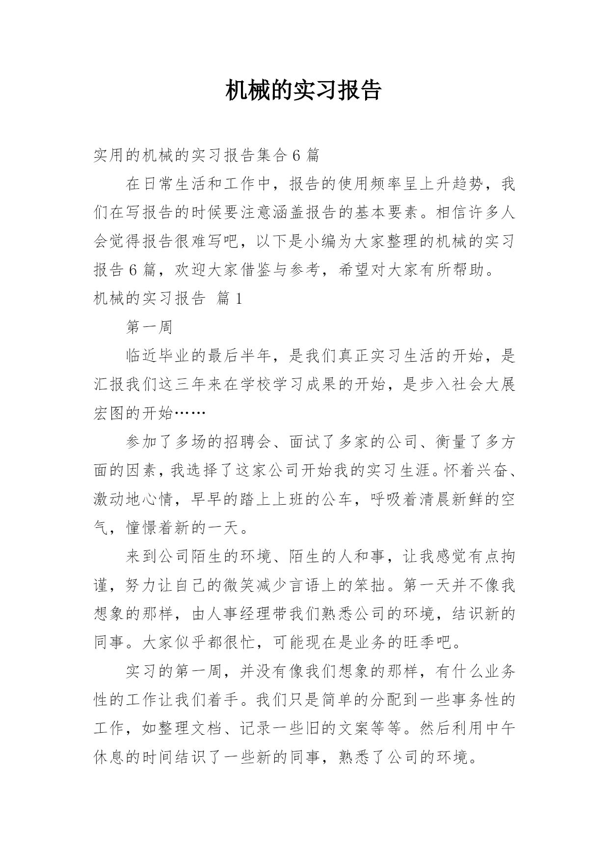 机械的实习报告实用的机械的实习报告集合6篇在日常生活和工作中,报告的使用频率呈上升趋势,我们在写报告的时候要注意涵盖报告的基本要素。相信许多人会觉得报告很难写吧,以下是小编为大家整理的机械的实习报告6篇,欢迎大家借鉴与参考,希望对大家有所帮助。机械的实习报告篇1第一周临近毕业的最后半年,是我们真正实习生活的开始,是汇报我们这三年来在学校学习成果的开始,是步入社会大展宏图的开始……参加了多场的招聘会、面试了多家的公司、衡量了多方面的因素,我选择了这家公司开始我的实习生涯。怀着兴奋、激动地心情,早早的踏上上班