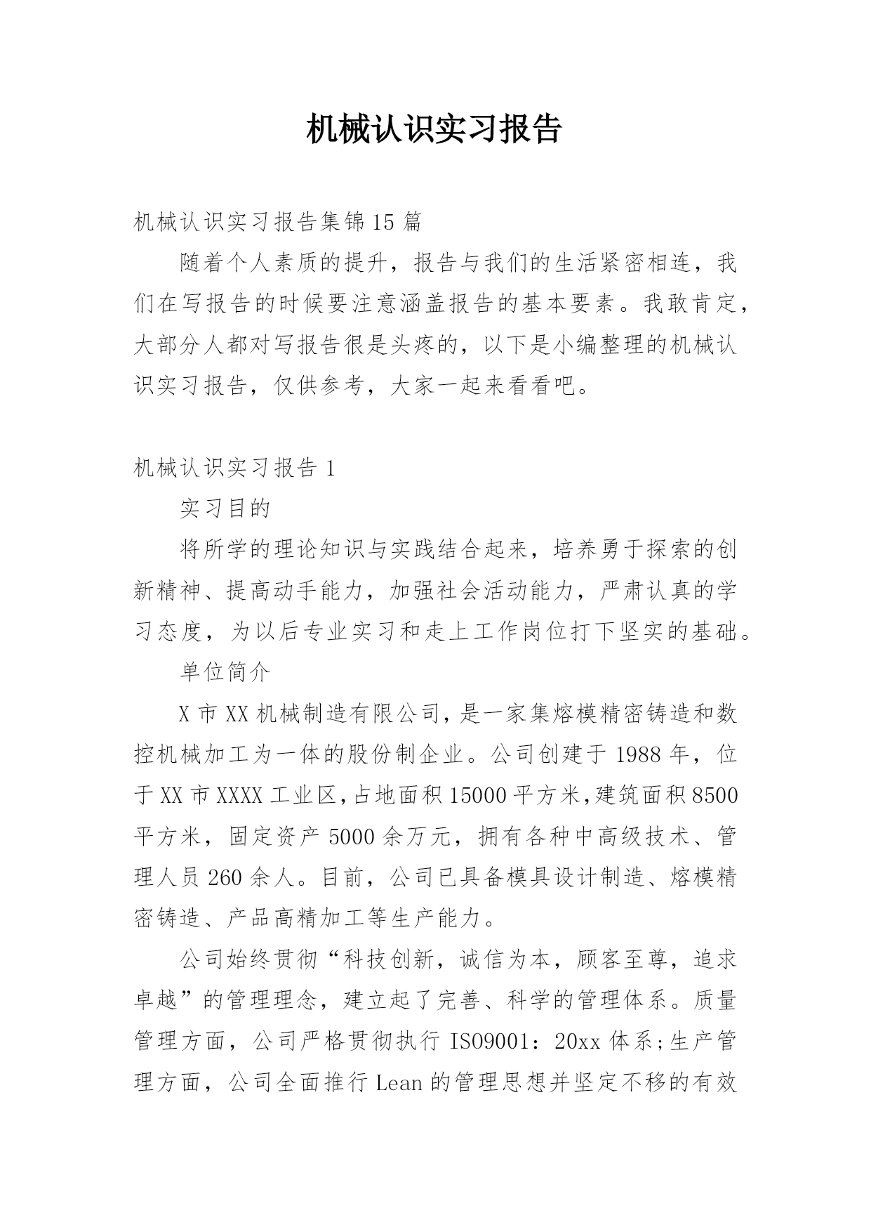 机械认识实习报告机械认识实习报告集锦15篇随着个人素质的提升,报告与我们的生活紧密相连,我们在写报告的时候要注意涵盖报告的基本要素。我敢肯定,大部分人都对写报告很是头疼的,以下是小编整理的机械认识实习报告,仅供参考,大家一起来看看吧。机械认识实习报告1实习目的将所学的理论知识与实践结合起来,培养勇于探索的创新精神、提高动手能力,加强社会活动能力,严肃认真的学习态度,为以后专业实习和走上工作岗位打下坚实的基础。单位简介X市XX机械制造有限公司,是一家集熔模精密铸造和数控机械加工为一体的股份制企业。公司创建于