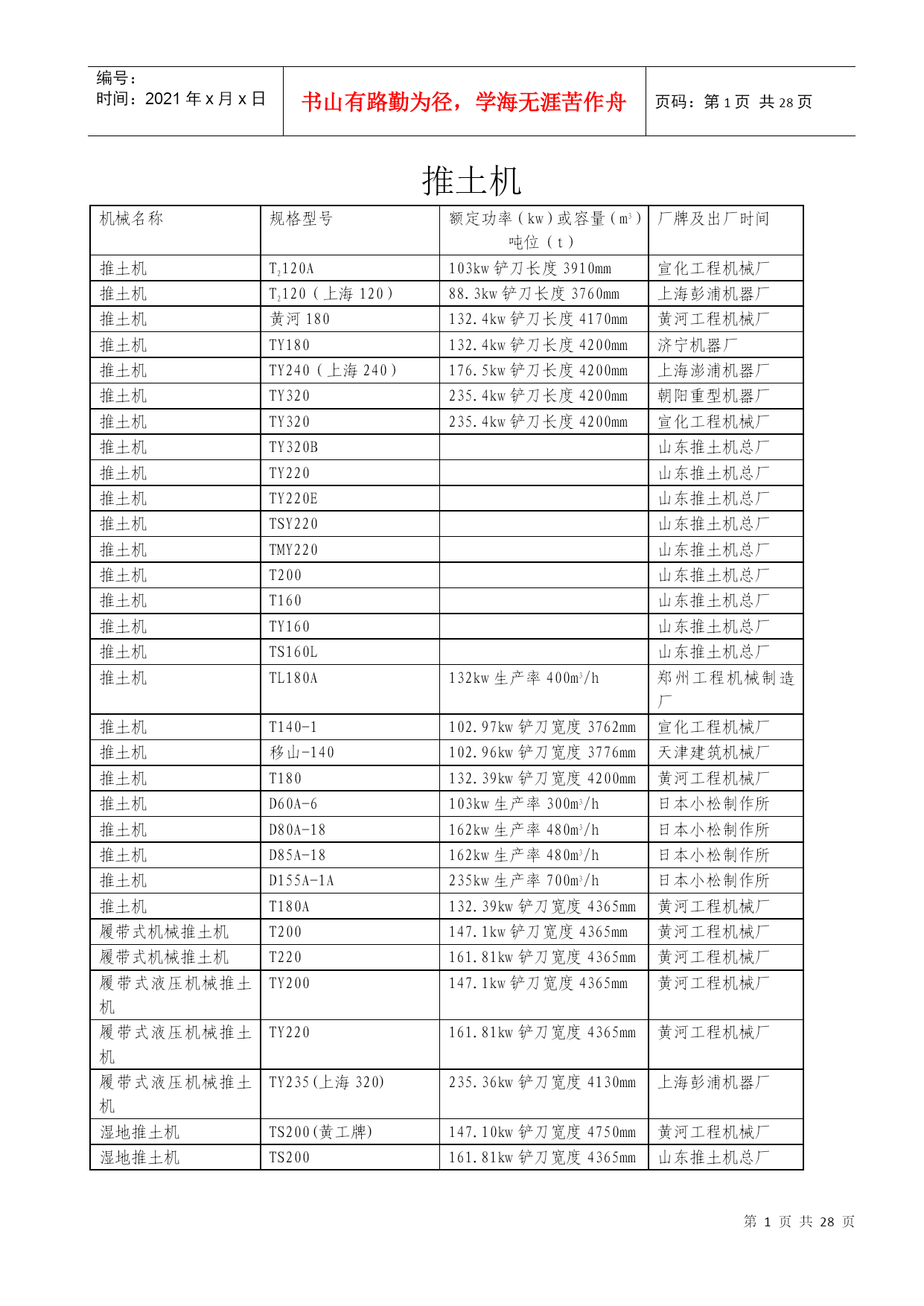 编号:时间:2021年x月x日书山有路勤为径,学海无涯苦作舟页码:第PAGE28页共NUMPAGES28页第PAGE\*MERGEFORMAT28页共NUMPAGES\*MERGEFORMAT28页推土机机械名称规格型号额定功率(kw)或容量(m3)吨位(t)厂牌及出厂时间推土机T2120A103kw铲刀长度3910mm宣化工程机械厂推土机T2120(上海120)88.3kw铲刀长度3760mm上海彭浦机器厂推土机黄河180132.4kw铲刀长度4170mm黄河工程机械厂推土机TY