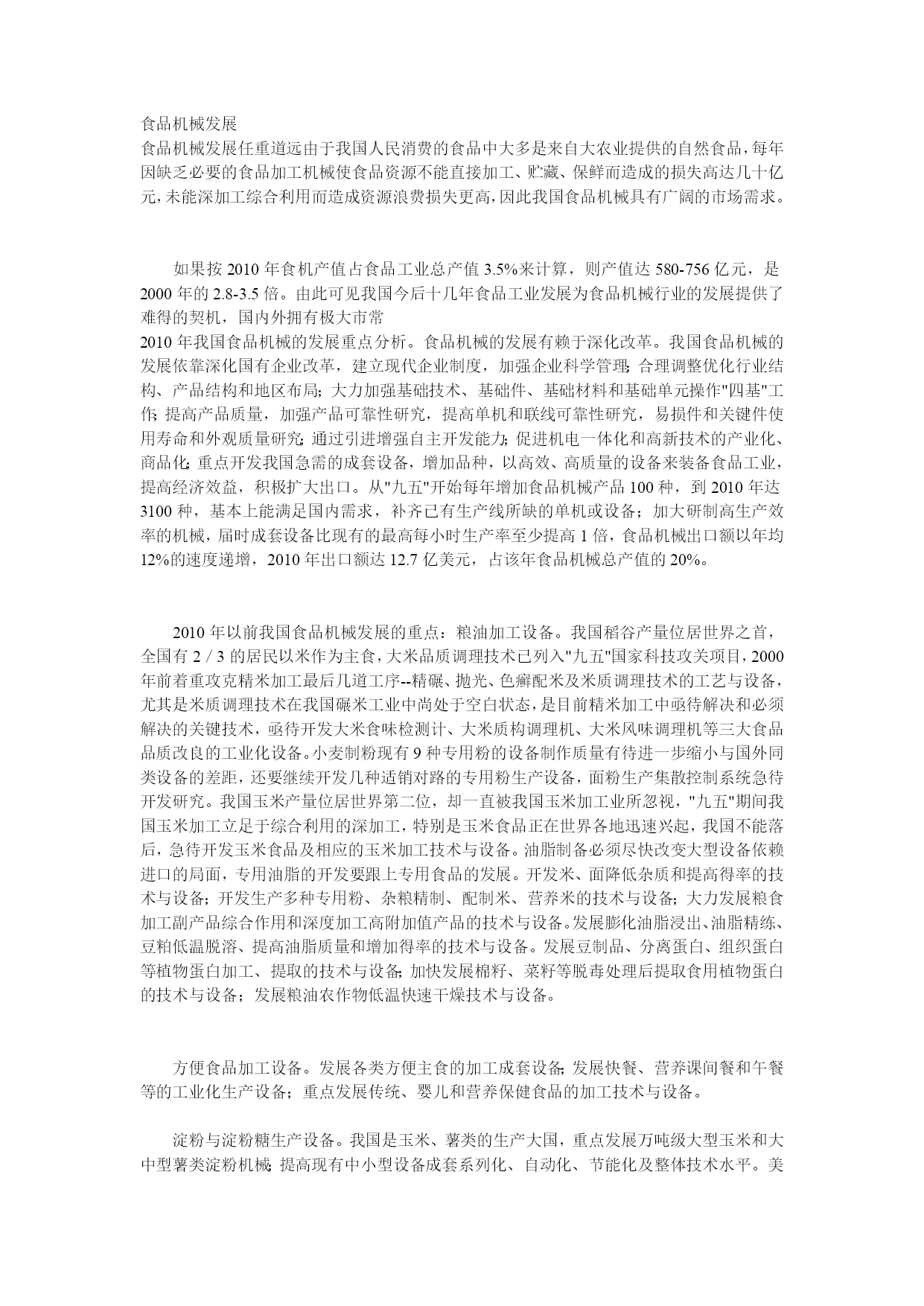食品机械发展食品机械发展任重道远由于我国人民消费的食品中大多是来自大农业提供的自然食品,每年因缺乏必要的食品加工机械使食品资源不能直接加工、贮藏、保鲜而造成的损失高达几十亿元,未能深加工综合利用而造成资源浪费损失更高,因此我国食品机械具有广阔的市场需求。如果按2010年食机产值占食品工业总产值3.5%来计算,则产值达580-756亿元,是2000年的2.8-3.5倍。由此可见我国今后十几年食品工业发展为食品机械行业的发展提供了难得的契机,国内外拥有极大市常2010年我国食品机械的发展重点分析。食品机械的发