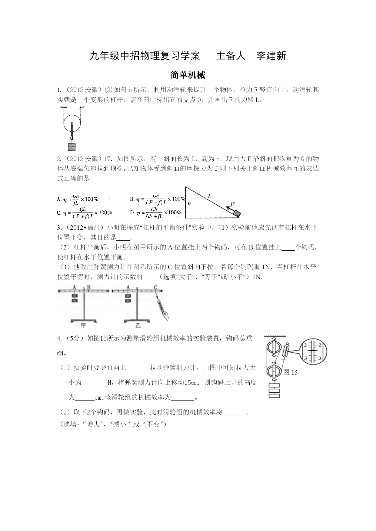 九年级中招物理复习学案主备人李建新简单机械1.(2012安徽)(2)如图b所示,利用动滑轮来提升一个物体,拉力F竖直向上。动滑轮其实就是一个变形的杠杆,请在图中标出它的支点O,并画出F的力臂L。2.(2012安徽)17.如图所示,有一斜面长为L,高为h,现用力F沿斜面把物重为G的物体从底端匀速拉到顶端。已知物体受到斜面的摩擦力为f则下列关于斜面机械效率η的表达式正确的是3.(2012•福州)小明在探究“杠杆的平衡条件”实验中,(1)实验前他应先调节杠杆在水平位置平衡,其目的是.(2)杠杆平衡后,小明在图甲