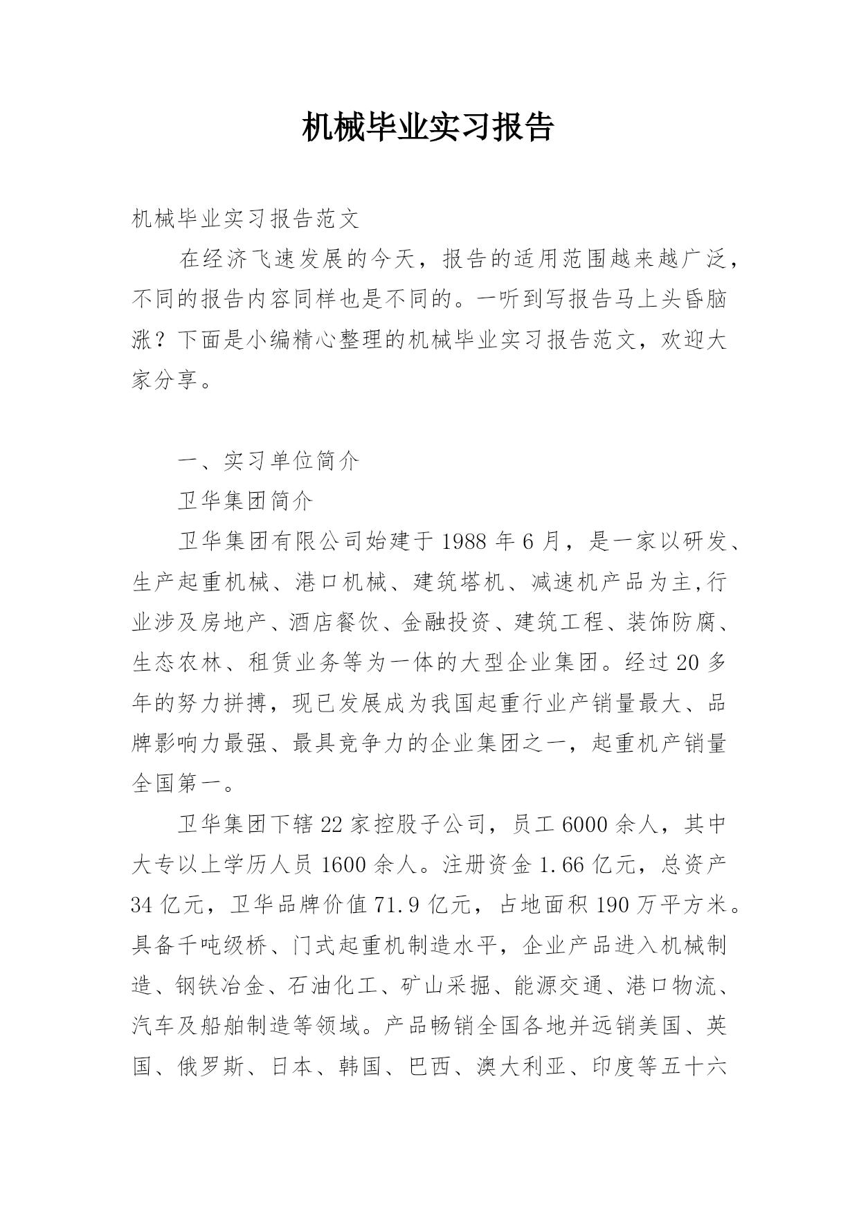 机械毕业实习报告机械毕业实习报告范文在经济飞速发展的今天,报告的适用范围越来越广泛,不同的报告内容同样也是不同的。一听到写报告马上头昏脑涨?下面是小编精心整理的机械毕业实习报告范文,欢迎大家分享。一、实习单位简介卫华集团简介卫华集团有限公司始建于1988年6月,是一家以研发、生产起重机械、港口机械、建筑塔机、减速机产品为主,行业涉及房地产、酒店餐饮、金融投资、建筑工程、装饰防腐、生态农林、租赁业务等为一体的大型企业集团。经过20多年的努力拼搏,现已发展成为我国起重行业产销量最大、品牌影响力最强、最具竞争力