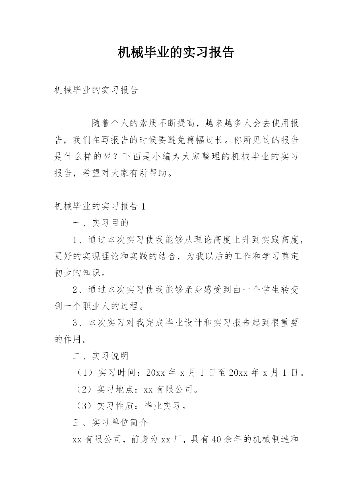 机械毕业的实习报告机械毕业的实习报告随着个人的素质不断提高,越来越多人会去使用报告,我们在写报告的时候要避免篇幅过长。你所见过的报告是什么样的呢?下面是小编为大家整理的机械毕业的实习报告,希望对大家有所帮助。机械毕业的实习报告1一、实习目的1、通过本次实习使我能够从理论高度上升到实践高度,更好的实现理论和实践的结合,为我以后的工作和学习奠定初步的知识。2、通过本次实习使我能够亲身感受到由一个学生转变到一个职业人的过程。3、本次实习对我完成毕业设计和实习报告起到很重要的作用。二、实习说明(1)实习时间:20