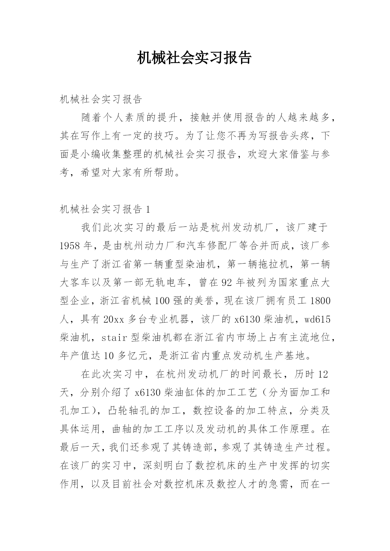 机械社会实习报告机械社会实习报告随着个人素质的提升,接触并使用报告的人越来越多,其在写作上有一定的技巧。为了让您不再为写报告头疼,下面是小编收集整理的机械社会实习报告,欢迎大家借鉴与参考,希望对大家有所帮助。机械社会实习报告1我们此次实习的最后一站是杭州发动机厂,该厂建于1958年,是由杭州动力厂和汽车修配厂等合并而成,该厂参与生产了浙江省第一辆重型染油机,第一辆拖拉机,第一辆大客车以及第一部无轨电车,曾在92年被列为国家重点大型企业,浙江省机械100强的美誉,现在该厂拥有员工1800人,具有20xx多台