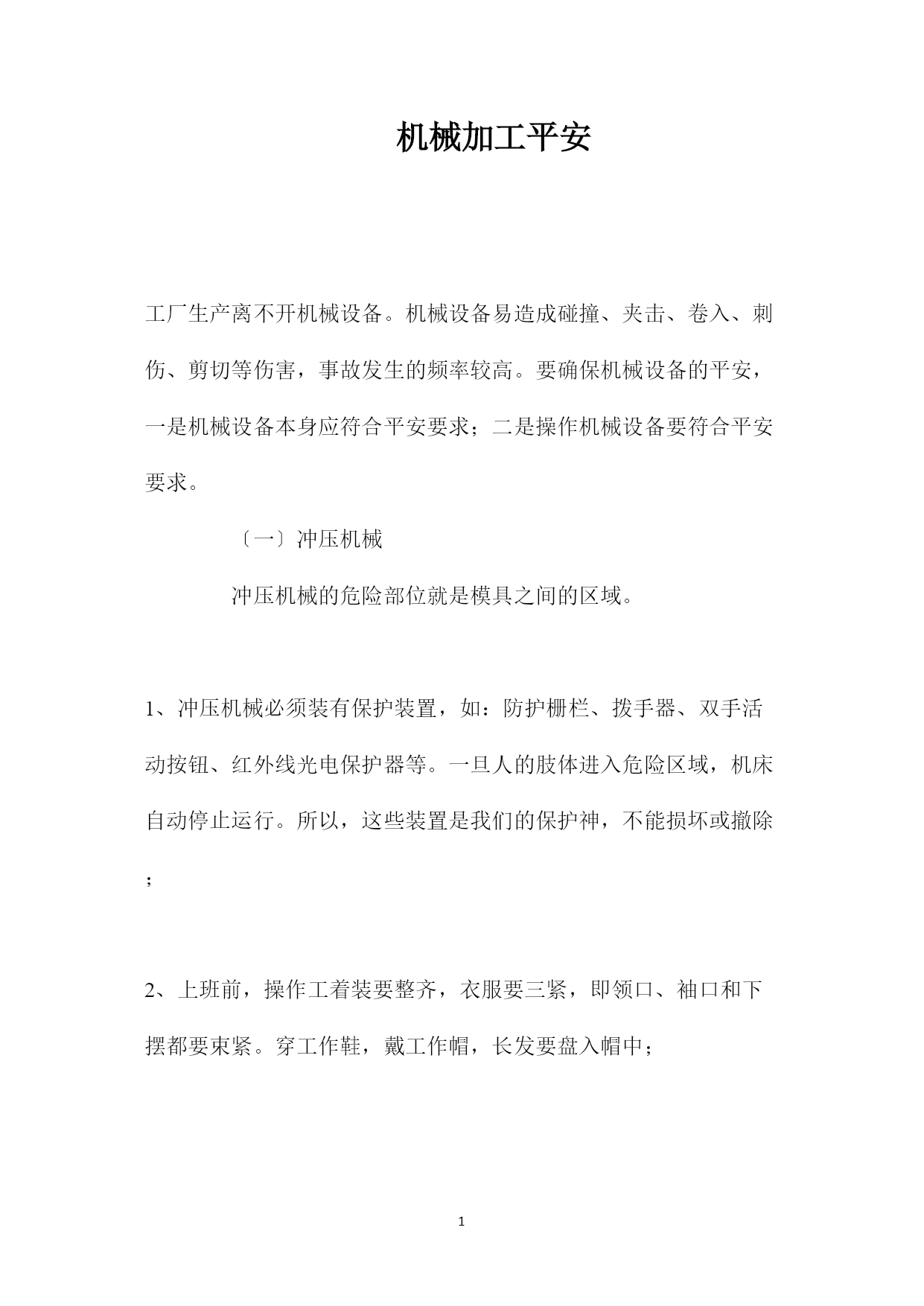 PAGEPAGE4机械加工平安工厂生产离不开机械设备。机械设备易造成碰撞、夹击、卷入、刺伤、剪切等伤害,事故发生的频率较高。要确保机械设备的平安,一是机械设备本身应符合平安要求;二是操作机械设备要符合平安要求。〔一〕冲压机械冲压机械的危险部位就是模具之间的区域。1、冲压机械必须装有保护装置,如:防护栅栏、拨手器、双手活动按钮、红外线光电保护器等。一旦人的肢体进入危险区域,机床自动停止运行。所以,这些装置是我们的保护神,不能损坏或撤除;2、上班前,操作工着装要整齐,衣服要三紧,即领口、袖口和下摆