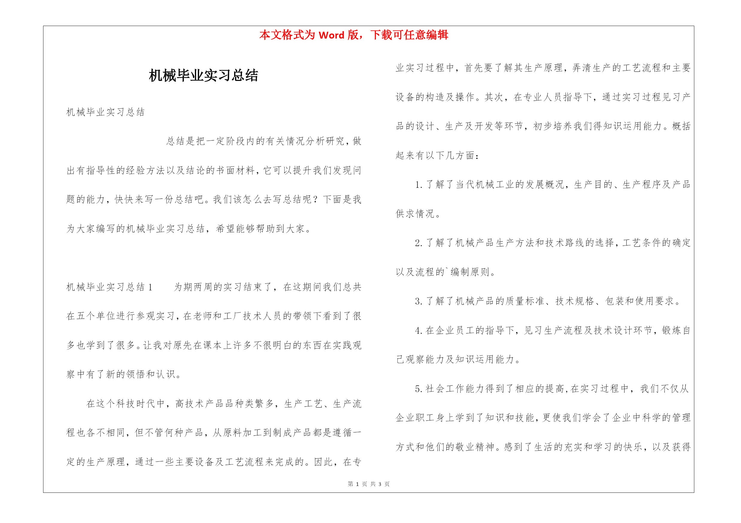 本文格式为Word版,下载可任意编辑第PAGE\*MERGEFORMAT3页共NUMPAGES\*MERGEFORMAT3页机械毕业实习总结机械毕业实习总结总结是把一定阶段内的有关情况分析研究,做出有指导性的经验方法以及结论的书面材料,它可以提升我们发现问题的能力,快快来写一份总结吧。我们该怎么去写总结呢?下面是我为大家编写的机械毕业实习总结,希望能够帮助到大家。机械毕业实习总结1为期两周的实习结束了,在这期间我们总共在五个单位进行参观实习,在老师和工厂技术人员的带领下看到了很多也学到了很多。