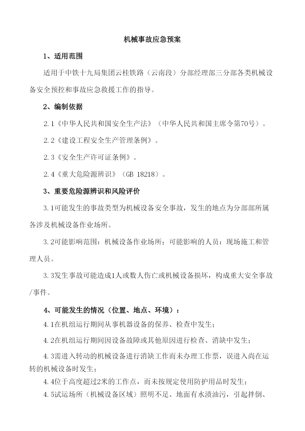 机械事故应急预案1、适用范围适用于中铁十九局集团云桂铁路(云南段)分部经理部三分部各类机械设备安全预控和事故应急救援工作的指导。2、编制依据2.1《中华人民共和国安全生产法》(中华人民共和国主席令第70号)。2.2《建设工程安全生产管理条例》。2.3《安全生产许可证条例》。2.4《重大危险源辨识》(GB18218)。3、重要危险源辨识和风险评价3.1可能发生的事故类型为机械设备安全事故,发生的地点为分部部所属各涉及机械设备作业场所。3.2可能影响范围:机械设备作业场所;可能影响的人员:现场施工和管理人员。