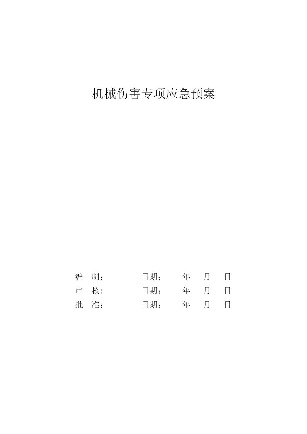 机械伤害专项应急预案编制:日期:年月日审核:日期:年月日批准:日期:年月日机械伤害专项应急预案为了有效预防、及时控制和减少事故,在事故发生时能够达到分级负责,反应快捷,行动迅速,统一指挥,尽可能的减少由于机械伤害事故所带来的危害,保持建筑工程可持续发展,依据《华冶公司安全生产事故综合应急预案》制定本预案。本预案适用于本项目部建筑工程发生的各类机械伤害事故的应对工作。1事故类型和危害程度分析机械伤害事故是人们在操作或使用机械过程中,因机械故障或操作人员的不安全行为等原因造成的伤害事故。机械伤害事故在地表建筑