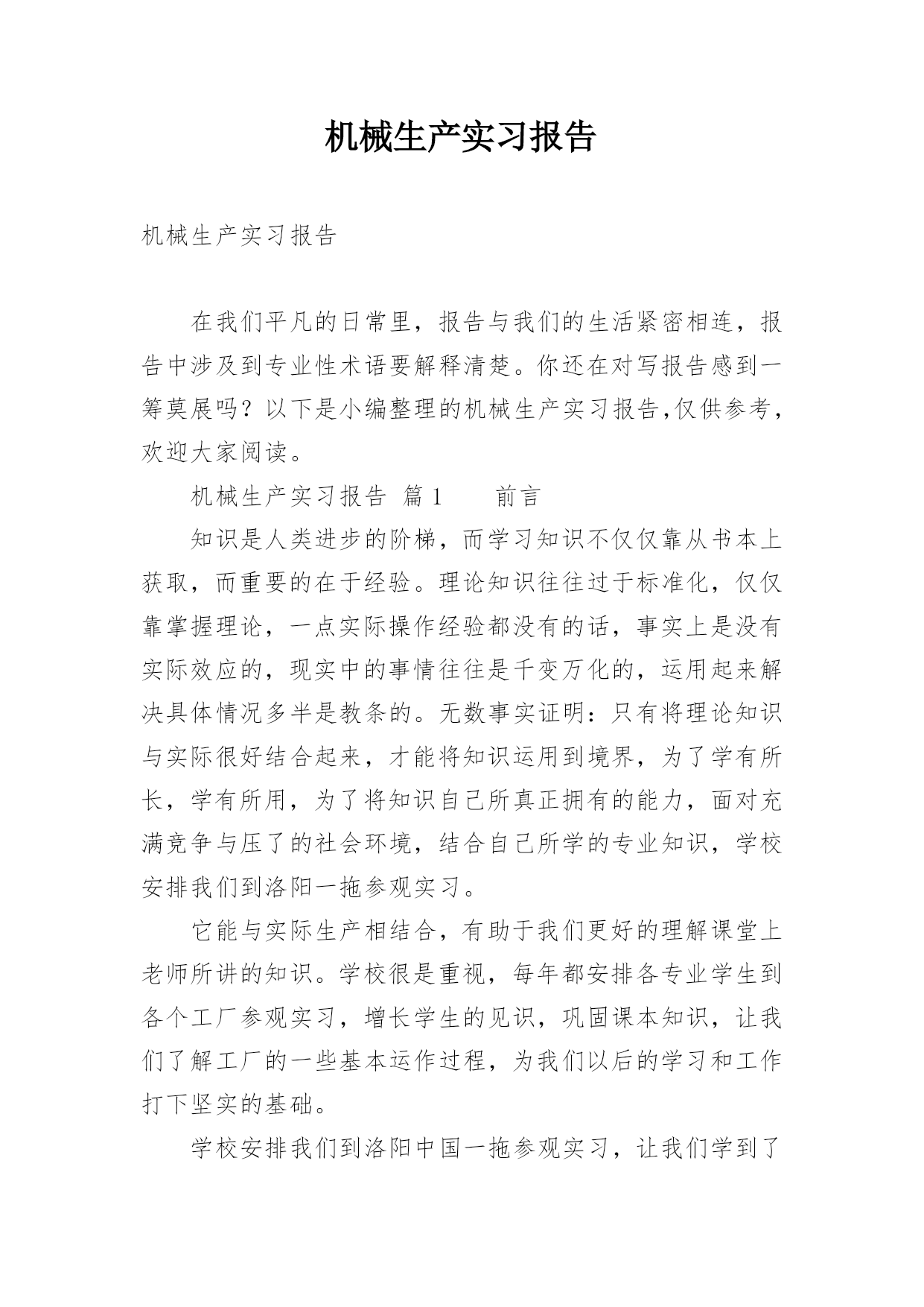 机械生产实习报告机械生产实习报告在我们平凡的日常里,报告与我们的生活紧密相连,报告中涉及到专业性术语要解释清楚。你还在对写报告感到一筹莫展吗?以下是小编整理的机械生产实习报告,仅供参考,欢迎大家阅读。机械生产实习报告篇1前言知识是人类进步的阶梯,而学习知识不仅仅靠从书本上获取,而重要的在于经验。理论知识往往过于标准化,仅仅靠掌握理论,一点实际操作经验都没有的话,事实上是没有实际效应的,现实中的事情往往是千变万化的,运用起来解决具体情况多半是教条的。无数事实证明:只有将理论知识与实际很好结合起来,才能将知识