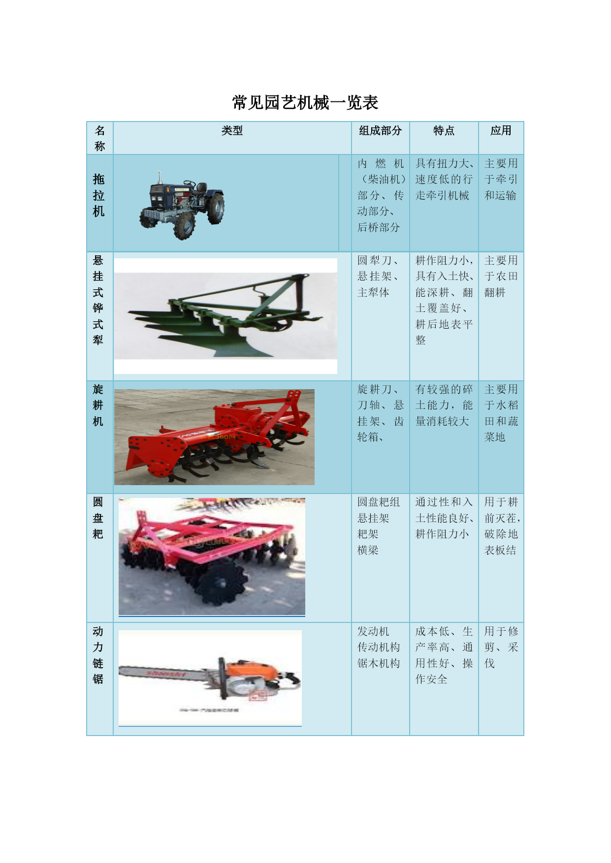 常见园艺机械一览表名称类型组成部分特点应用拖拉机内燃机(柴油机)部分、传动部分、后桥部分具有扭力大、速度低的行走牵引机械主要用于牵引和运输悬挂式铧式犁圆犁刀、悬挂架、主犁体耕作阻力小,具有入土快、能深耕、翻土覆盖好、耕后地表平整主要用于农田翻耕旋耕机旋耕刀、刀轴、悬挂架、齿轮箱、有较强的碎土能力,能量消耗较大主要用于水稻田和蔬菜地圆盘耙圆盘耙组悬挂架耙架横梁通过性和入土性能良好、耕作阻力小用于耕前灭茬,破除地表板结动力链锯发动机传动机构锯木机构成本低、生产率高、通用性好、操作安全用于修剪、采伐气动修枝剪动