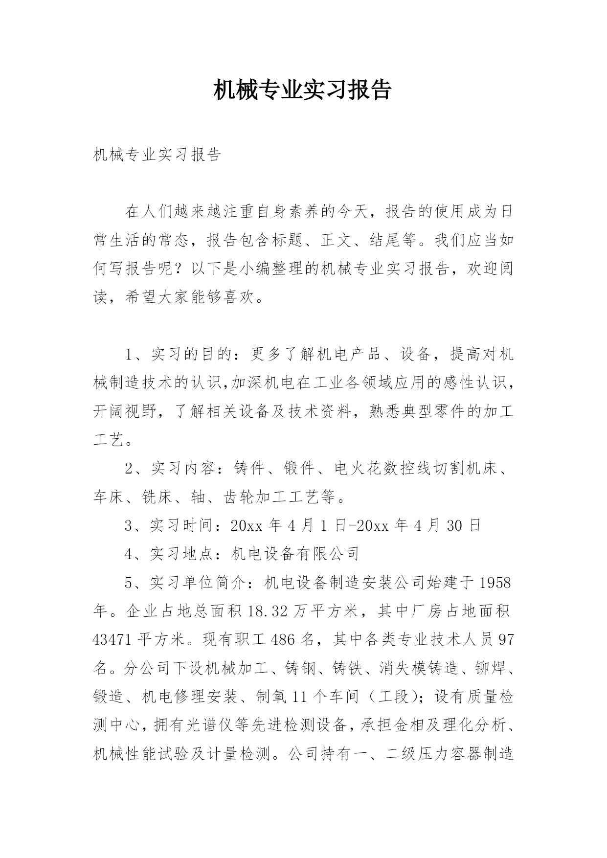 机械专业实习报告机械专业实习报告在人们越来越注重自身素养的今天,报告的使用成为日常生活的常态,报告包含标题、正文、结尾等。我们应当如何写报告呢?以下是小编整理的机械专业实习报告,欢迎阅读,希望大家能够喜欢。1、实习的目的:更多了解机电产品、设备,提高对机械制造技术的认识,加深机电在工业各领域应用的感性认识,开阔视野,了解相关设备及技术资料,熟悉典型零件的加工工艺。2、实习内容:铸件、锻件、电火花数控线切割机床、车床、铣床、轴、齿轮加工工艺等。3、实习时间:20xx年4月1日-20xx年4月30日4、实习地