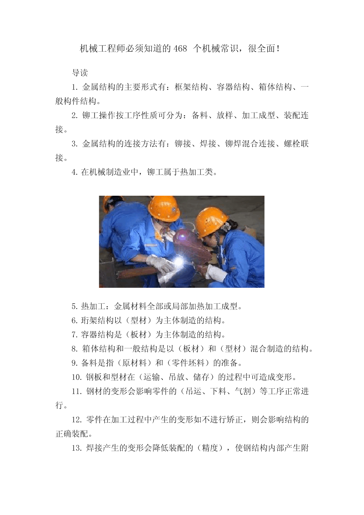 机械工程师必须知道的468个机械常识,很全面!导读1.金属结构的主要形式有:框架结构、容器结构、箱体结构、一般构件结构。2.铆工操作按工序性质可分为:备料、放样、加工成型、装配连接。3.金属结构的连接方法有:铆接、焊接、铆焊混合连接、螺栓联接。4.在机械制造业中,铆工属于热加工类。5.热加工:金属材料全部或局部加热加工成型。6.珩架结构以(型材)为主体制造的结构。7.容器结构是(板材)为主体制造的结构。8.箱体结构和一般结构是以(板材)和(型材)混合制造的结构。9.备料是指(原材料)和(零件坯料)的准备。