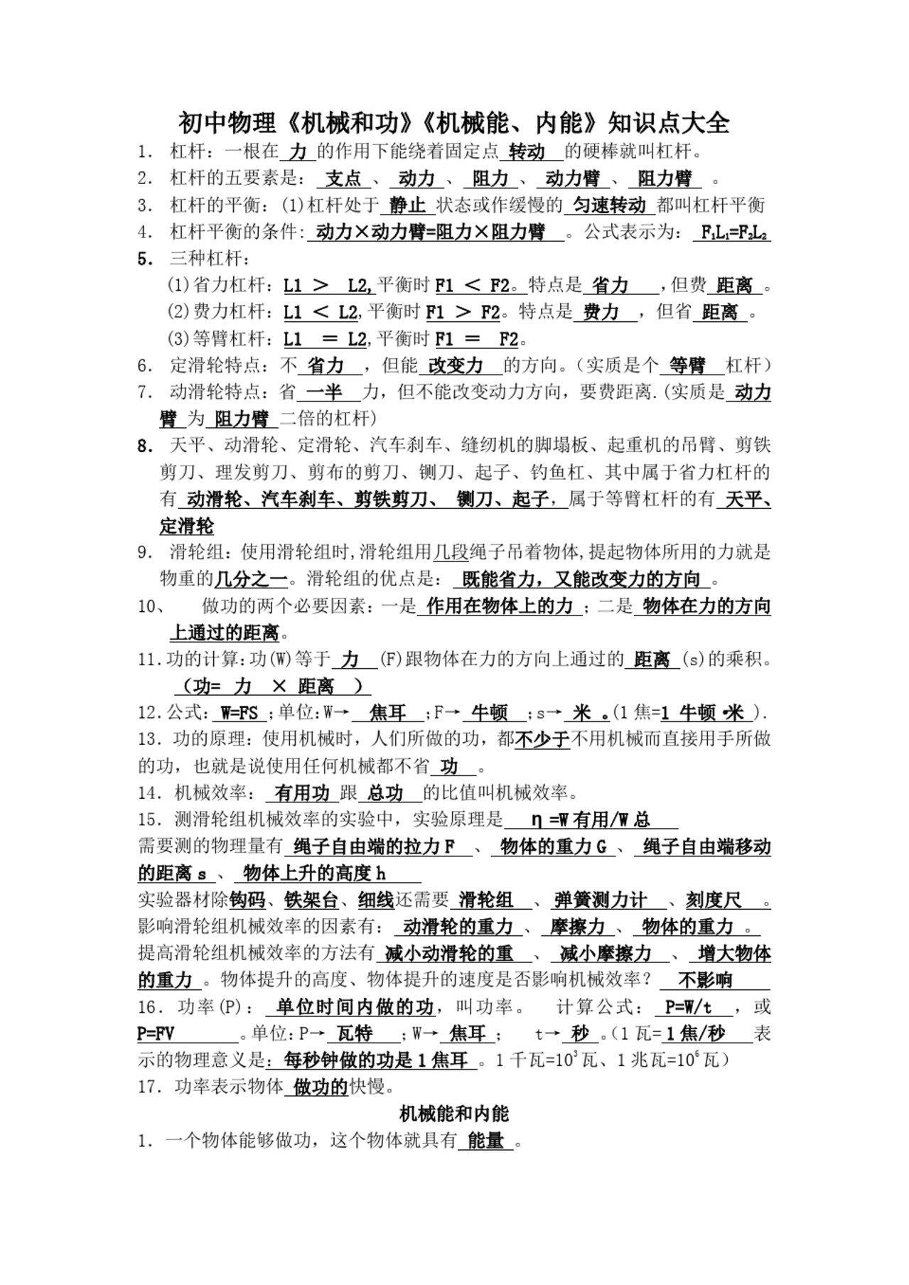 初中物理《机械和功》《机械能、内能》知识点大全.pdf
