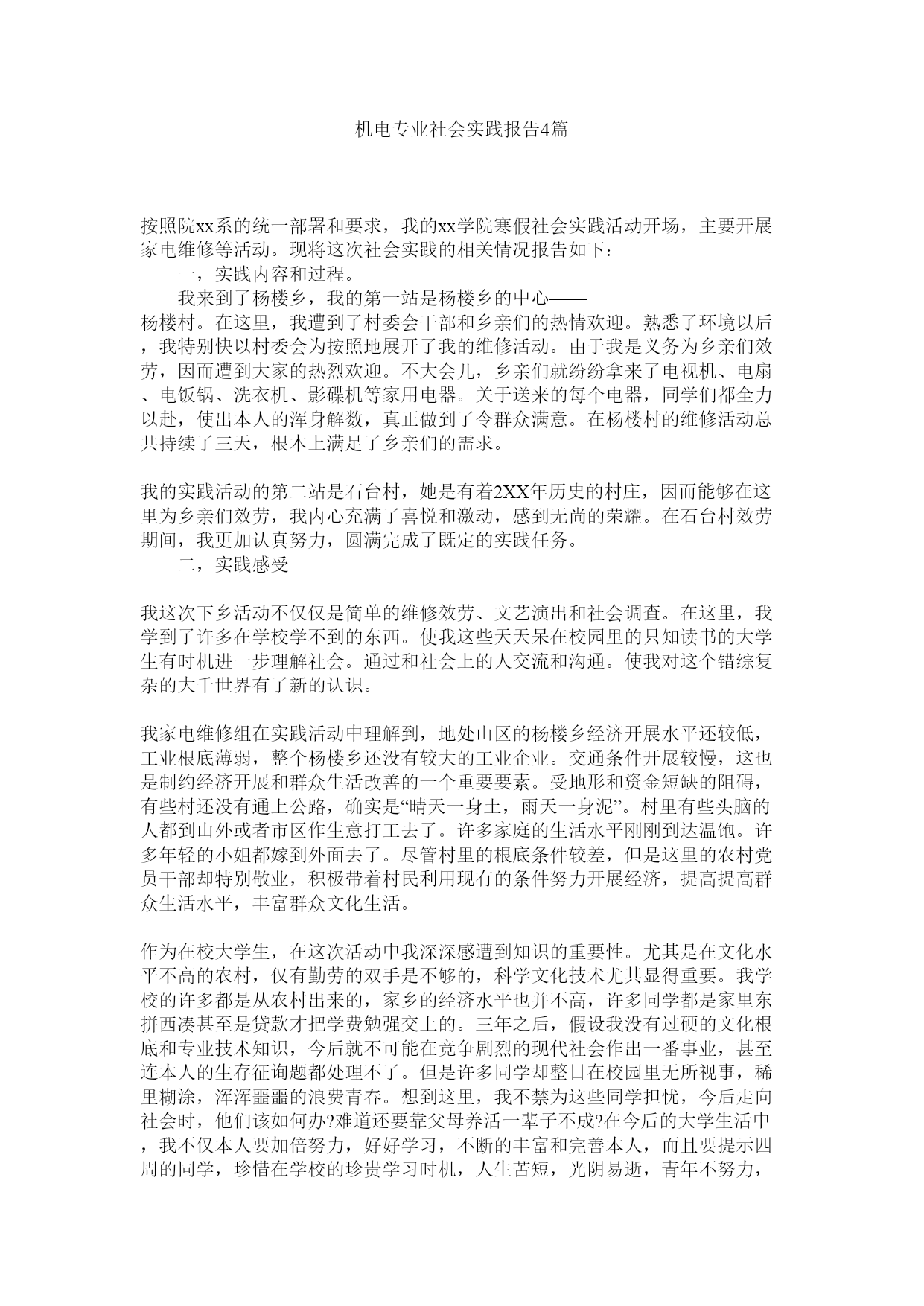 机电专业社会实践报告4篇按照院xx系的统一部署和要求,我的xx学院寒假社会实践活动开场,主要开展家电维修等活动。现将这次社会实践的相关情况报告如下:一,实践内容和过程。我来到了杨楼乡,我的第一站是杨楼乡的中心——杨楼村。在这里,我遭到了村委会干部和乡亲们的热情欢迎。熟悉了环境以后,我特别快以村委会为按照地展开了我的维修活动。由于我是义务为乡亲们效劳,因而遭到大家的热烈欢迎。不大会儿,乡亲们就纷纷拿来了电视机、电扇、电饭锅、洗衣机、影碟机等家用电器。关于送来的每个电器,同学们都全力以赴,使出本人的浑身解数,