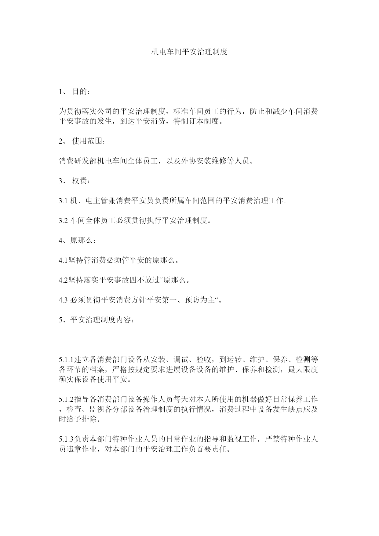 机电车间平安治理制度1、目的:为贯彻落实公司的平安治理制度,标准车间员工的行为,防止和减少车间消费平安事故的发生,到达平安消费,特制订本制度。2、使用范围:消费研发部机电车间全体员工,以及外协安装维修等人员。3、权责:3.1机、电主管兼消费平安员负责所属车间范围的平安消费治理工作。3.2车间全体员工必须贯彻执行平安治理制度。4、原那么:4.1坚持管消费必须管平安的原那么。4.2坚持落实平安事故四不放过“原那么。4.3必须贯彻平安消费方针平安第一、预防为主“。5、平安治理制度内容:5.1.1建立各消费部门设
