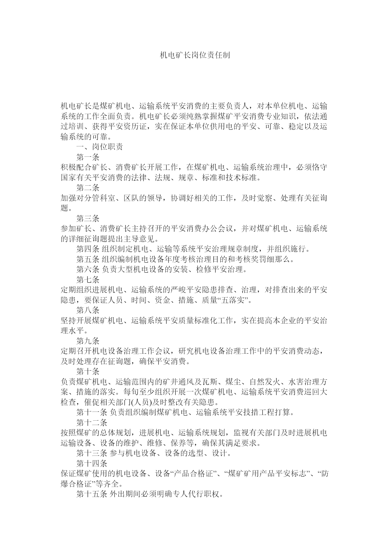 机电矿长岗位责任制机电矿长是煤矿机电、运输系统平安消费的主要负责人,对本单位机电、运输系统的工作全面负责。机电矿长必须纯熟掌握煤矿平安消费专业知识,依法通过培训、获得平安资历证,实在保证本单位供用电的平安、可靠、稳定以及运输系统的可靠。一、岗位职责第一条积极配合矿长、消费矿长开展工作,在煤矿机电、运输系统治理中,必须恪守国家有关平安消费的法律、法规、规章、标准和技术标准。第二条加强对分管科室、区队的领导,协调好相关的工作,及时觉察、处理有关征询题。第三条参加矿长、消费矿长主持召开的平安消费办公会议,并对煤