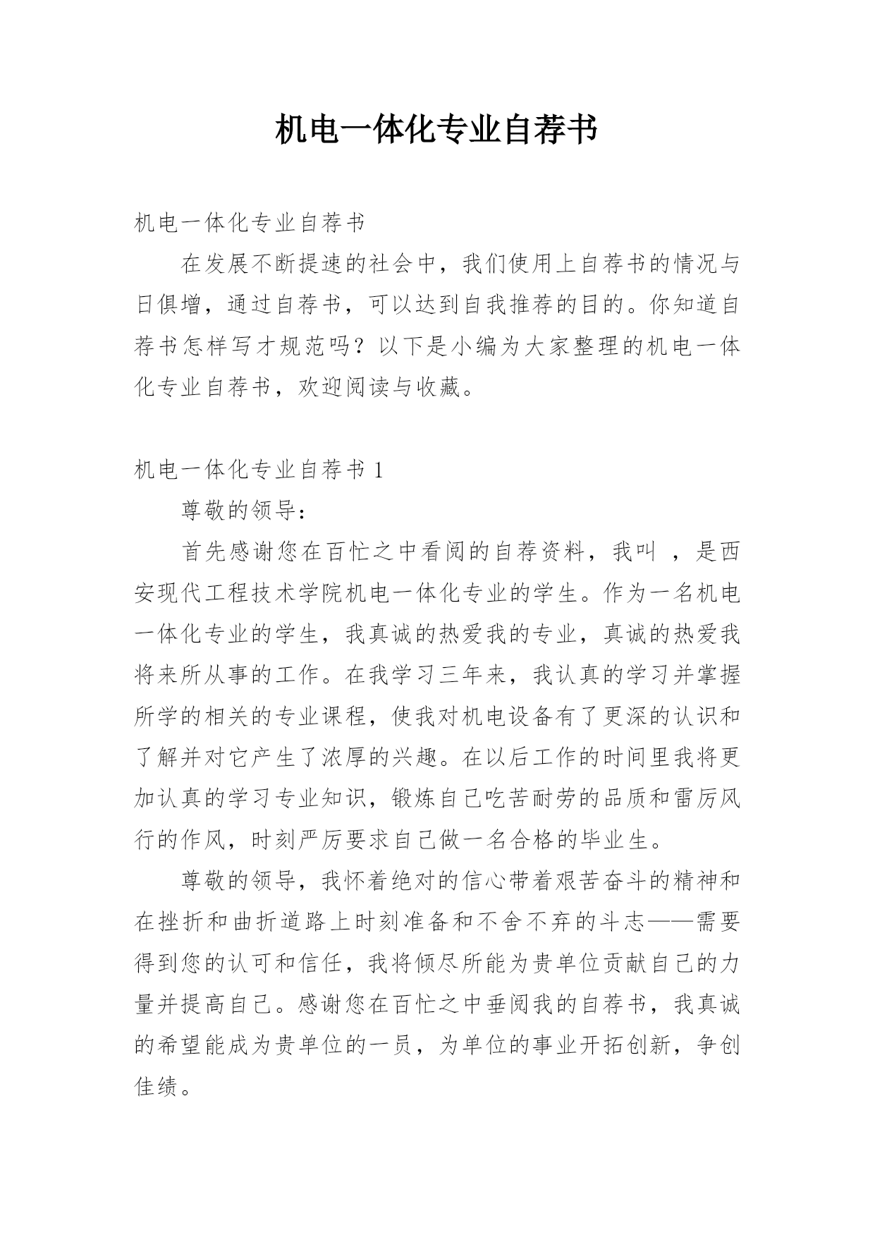 机电一体化专业自荐书机电一体化专业自荐书在发展不断提速的社会中,我们使用上自荐书的情况与日俱增,通过自荐书,可以达到自我推荐的目的。你知道自荐书怎样写才规范吗?以下是小编为大家整理的机电一体化专业自荐书,欢迎阅读与收藏。机电一体化专业自荐书1尊敬的领导:首先感谢您在百忙之中看阅的自荐资料,我叫,是西安现代工程技术学院机电一体化专业的学生。作为一名机电一体化专业的学生,我真诚的热爱我的专业,真诚的热爱我将来所从事的工作。在我学习三年来,我认真的学习并掌握所学的相关的专业课程,使我对机电设备有了更深的认识和了