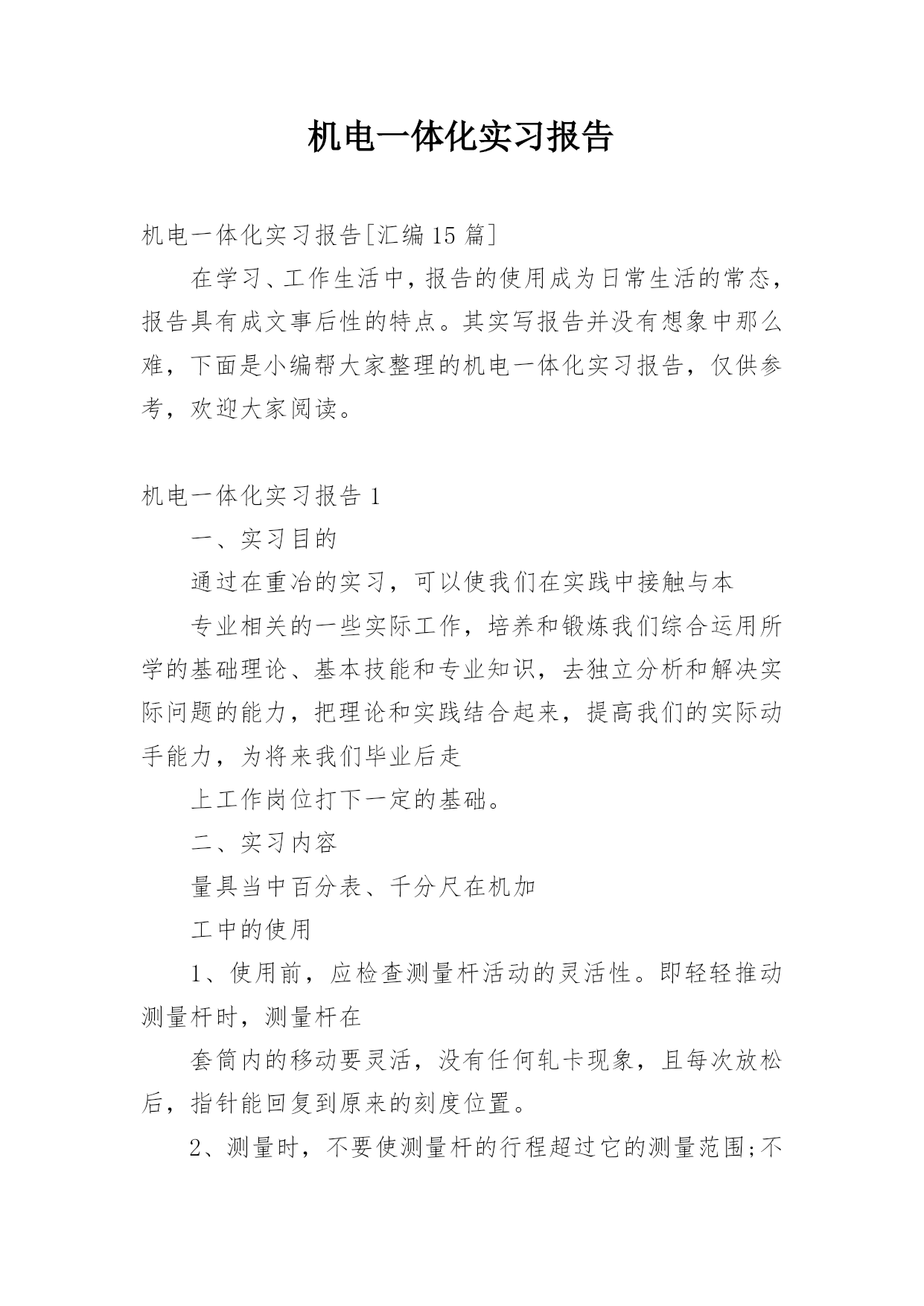 机电一体化实习报告机电一体化实习报告[汇编15篇]在学习、工作生活中,报告的使用成为日常生活的常态,报告具有成文事后性的特点。其实写报告并没有想象中那么难,下面是小编帮大家整理的机电一体化实习报告,仅供参考,欢迎大家阅读。机电一体化实习报告1一、实习目的通过在重冶的实习,可以使我们在实践中接触与本专业相关的一些实际工作,培养和锻炼我们综合运用所学的基础理论、基本技能和专业知识,去独立分析和解决实际问题的能力,把理论和实践结合起来,提高我们的实际动手能力,为将来我们毕业后走上工作岗位打下一定的基础。二、实习