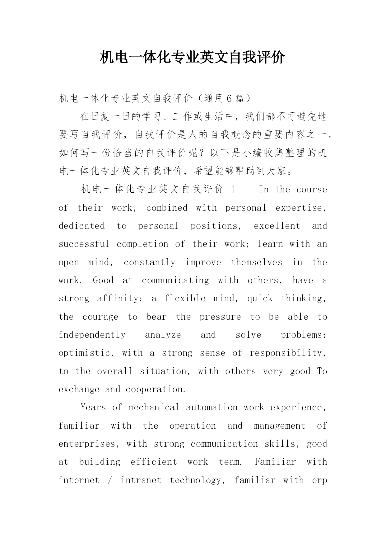 机电一体化专业英文自我评价机电一体化专业英文自我评价(通用6篇)在日复一日的学习、工作或生活中,我们都不可避免地要写自我评价,自我评价是人的自我概念的重要内容之一。如何写一份恰当的自我评价呢?以下是小编收集整理的机电一体化专业英文自我评价,希望能够帮助到大家。机电一体化专业英文自我评价1Inthecourseoftheirwork,combinedwithpersonalexpertise,dedicatedtopersonalpositions,excellentandsuccessfulcomplet