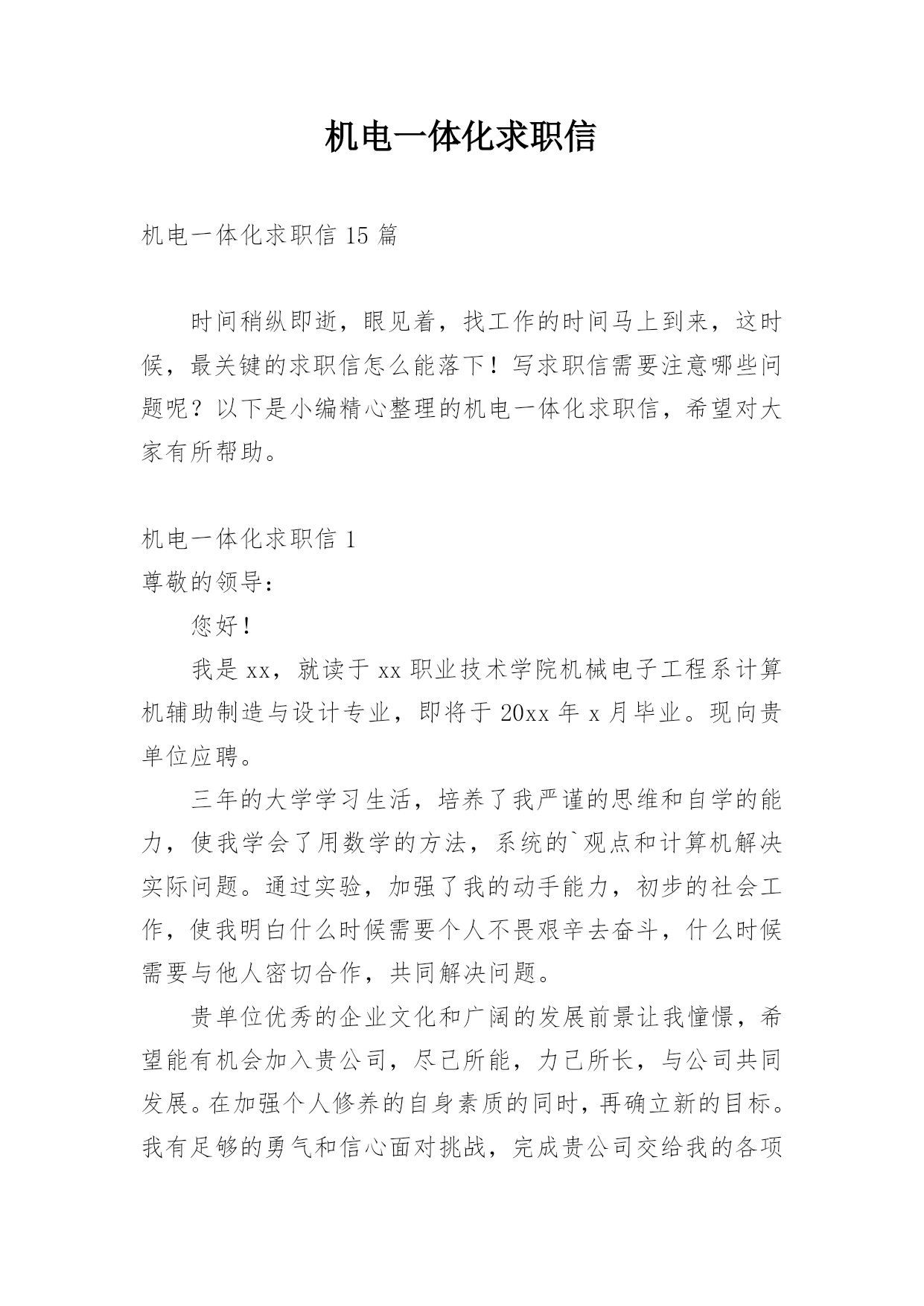 机电一体化求职信机电一体化求职信15篇时间稍纵即逝,眼见着,找工作的时间马上到来,这时候,最关键的求职信怎么能落下!写求职信需要注意哪些问题呢?以下是小编精心整理的机电一体化求职信,希望对大家有所帮助。机电一体化求职信1尊敬的领导:您好!我是xx,就读于xx职业技术学院机械电子工程系计算机辅助制造与设计专业,即将于20xx年x月毕业。现向贵单位应聘。三年的大学学习生活,培养了我严谨的思维和自学的能力,使我学会了用数学的方法,系统的`观点和计算机解决实际问题。通过实验,加强了我的动手能力,初步的社会工作,使