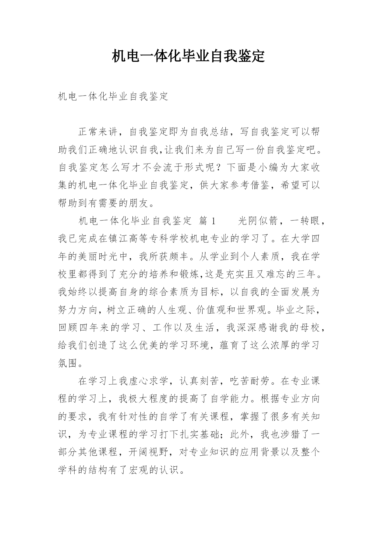 机电一体化毕业自我鉴定机电一体化毕业自我鉴定正常来讲,自我鉴定即为自我总结,写自我鉴定可以帮助我们正确地认识自我,让我们来为自己写一份自我鉴定吧。自我鉴定怎么写才不会流于形式呢?下面是小编为大家收集的机电一体化毕业自我鉴定,供大家参考借鉴,希望可以帮助到有需要的朋友。机电一体化毕业自我鉴定篇1光阴似箭,一转眼,我已完成在镇江高等专科学校机电专业的学习了。在大学四年的美丽时光中,我所获颇丰。从学业到个人素质,我在学校里都得到了充分的培养和锻炼,这是充实且又难忘的三年。我始终以提高自身的综合素质为目标,以自我