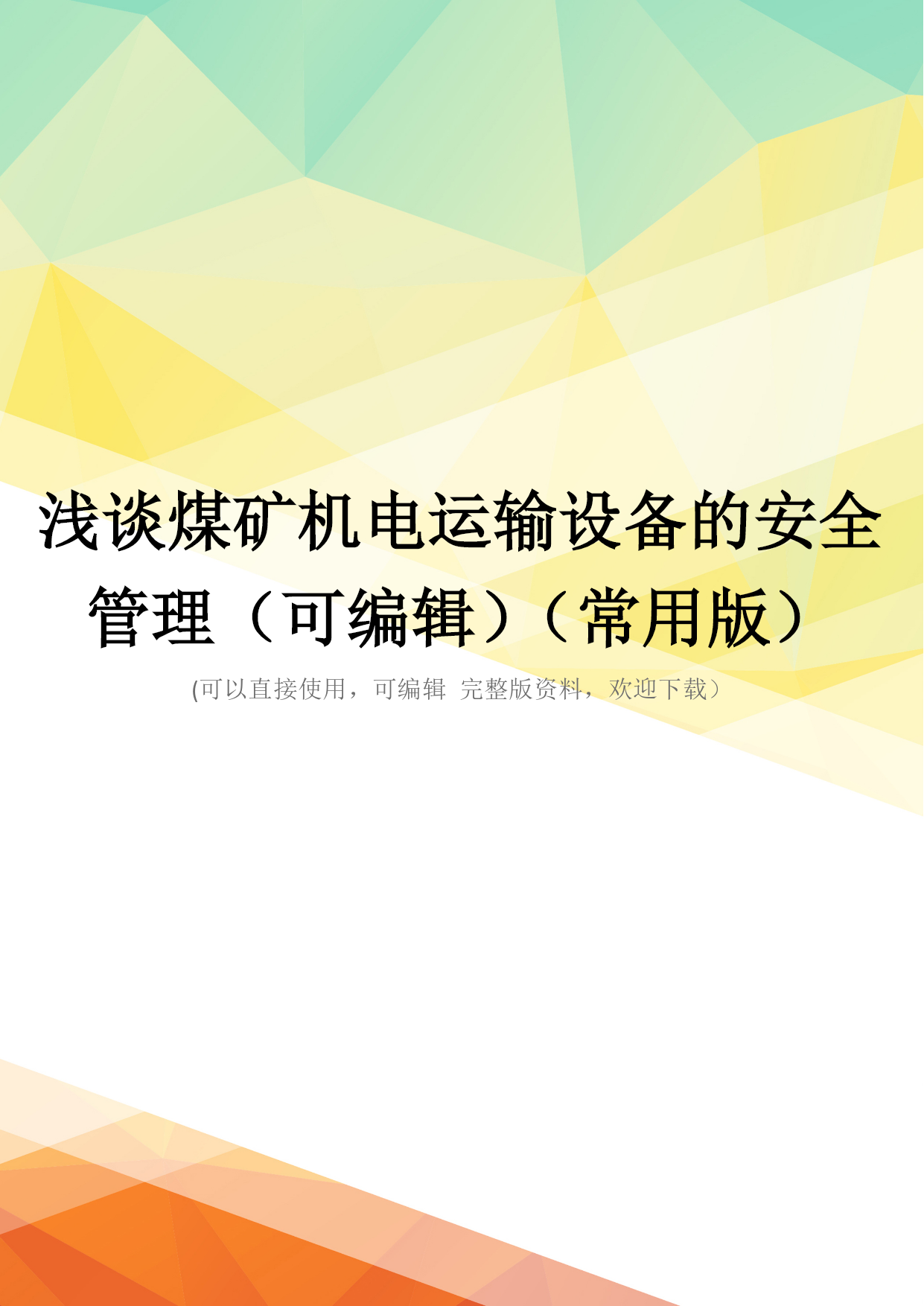 浅谈煤矿机电运输设备的安全管理(可编辑)(常用版)(可以直接使用,可编辑完整版资料,欢迎下载)浅谈煤矿机电运输设备的安全管理◇能源科技◇年期科技向导浅谈煤矿机电运输设备的安全管理王宪江龙煤集团双鸭山分公司七星煤矿黑龙江友谊【摘要】在煤矿生产作业中,机电运输设备是最为重要的组成部分。贯穿于矿井生产全过程的各个环节.但是由于运输设备的运行任务繁重,调动频率大,同时设备工作的环境相对恶劣,所以大多数机器设备缺乏应有的维修和保护。但是当下.随着我国煤矿开采的革新.采矿能力得到普遍的提高,这导致机电运输系统的应用时