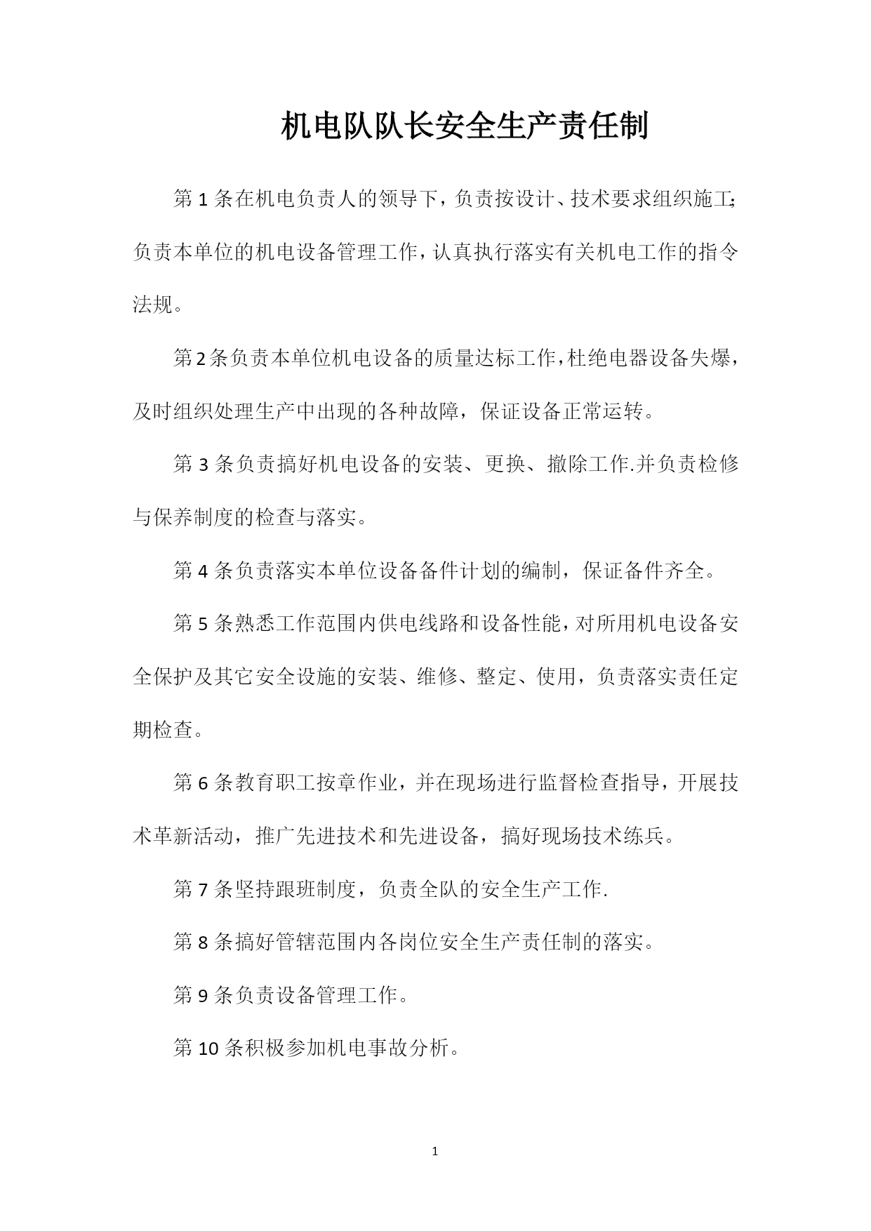 PAGEPAGE2机电队队长安全生产责任制第1条在机电负责人的领导下,负责按设计、技术要求组织施工;负责本单位的机电设备管理工作,认真执行落实有关机电工作的指令法规。第2条负责本单位机电设备的质量达标工作,杜绝电器设备失爆,及时组织处理生产中出现的各种故障,保证设备正常运转。第3条负责搞好机电设备的安装、更换、撤除工作.并负责检修与保养制度的检查与落实。第4条负责落实本单位设备备件计划的编制,保证备件齐全。第5条熟悉工作范围内供电线路和设备性能,对所用机电设备安全保护及其它安全设施的安装、维修