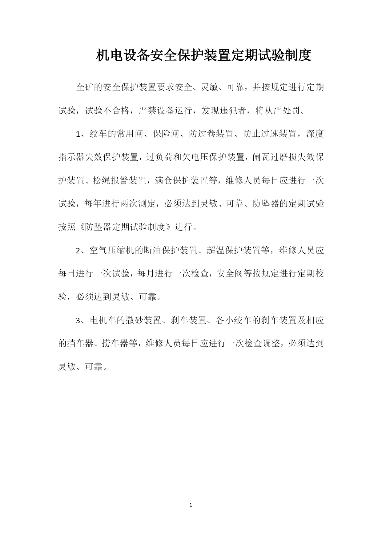 PAGEPAGE1机电设备安全保护装置定期试验制度全矿的安全保护装置要求安全、灵敏、可靠,并按规定进行定期试验,试验不合格,严禁设备运行,发现违犯者,将从严处罚。1、绞车的常用闸、保险闸、防过卷装置、防止过速装置,深度指示器失效保护装置,过负荷和欠电压保护装置,闸瓦过磨损失效保护装置、松绳报警装置,满仓保护装置等,维修人员每日应进行一次试验,每年进行两次测定,必须达到灵敏、可靠。防坠器的定期试验按照《防坠器定期试验制度》进行。2、空气压缩机的断油保护装置、超温保护装置等,维修人员应每日进行一次