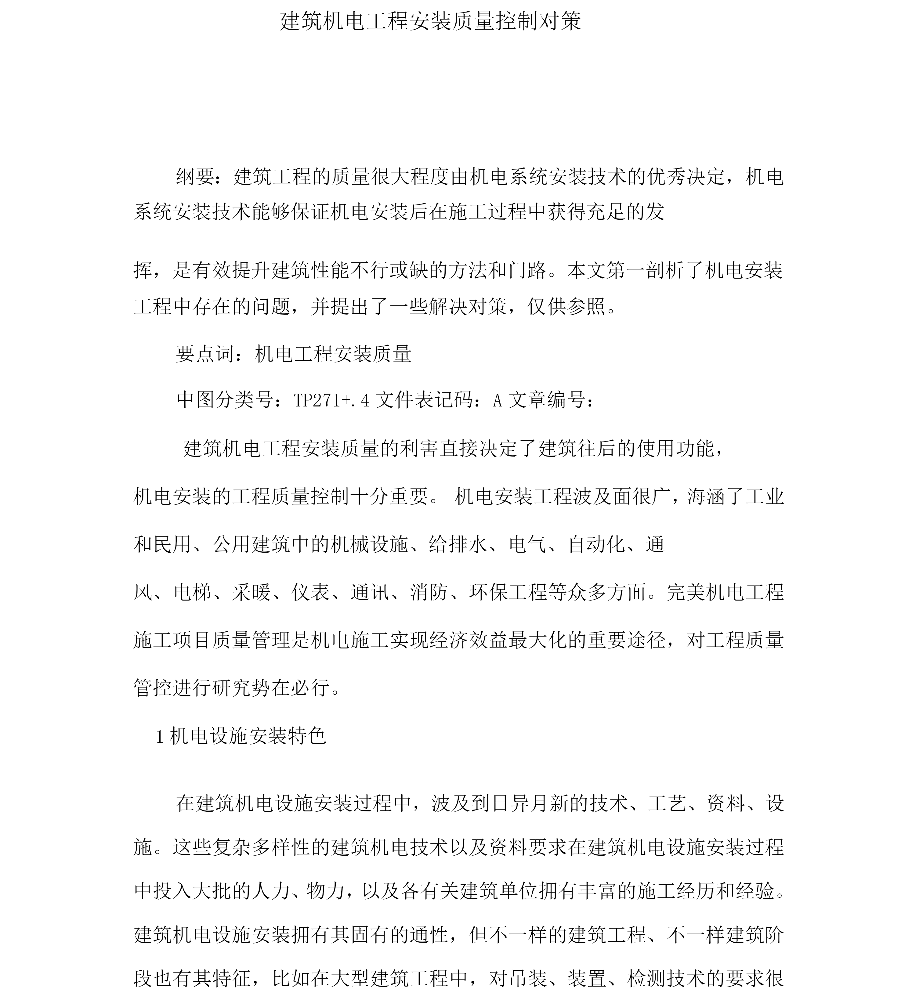 建筑机电工程安装质量控制对策纲要:建筑工程的质量很大程度由机电系统安装技术的优秀决定,机电系统安装技术能够保证机电安装后在施工过程中获得充足的发挥,是有效提升建筑性能不行或缺的方法和门路。本文第一剖析了机电安装工程中存在的问题,并提出了一些解决对策,仅供参照。要点词:机电工程安装质量中图分类号:TP271+.4文件表记码:A文章编号:建筑机电工程安装质量的利害直接决定了建筑往后的使用功能,机电安装的工程质量控制十分重要。机电安装工程波及面很广,海涵了工业和民用、公用建筑中的机械设施、给排水、电气、自动化、