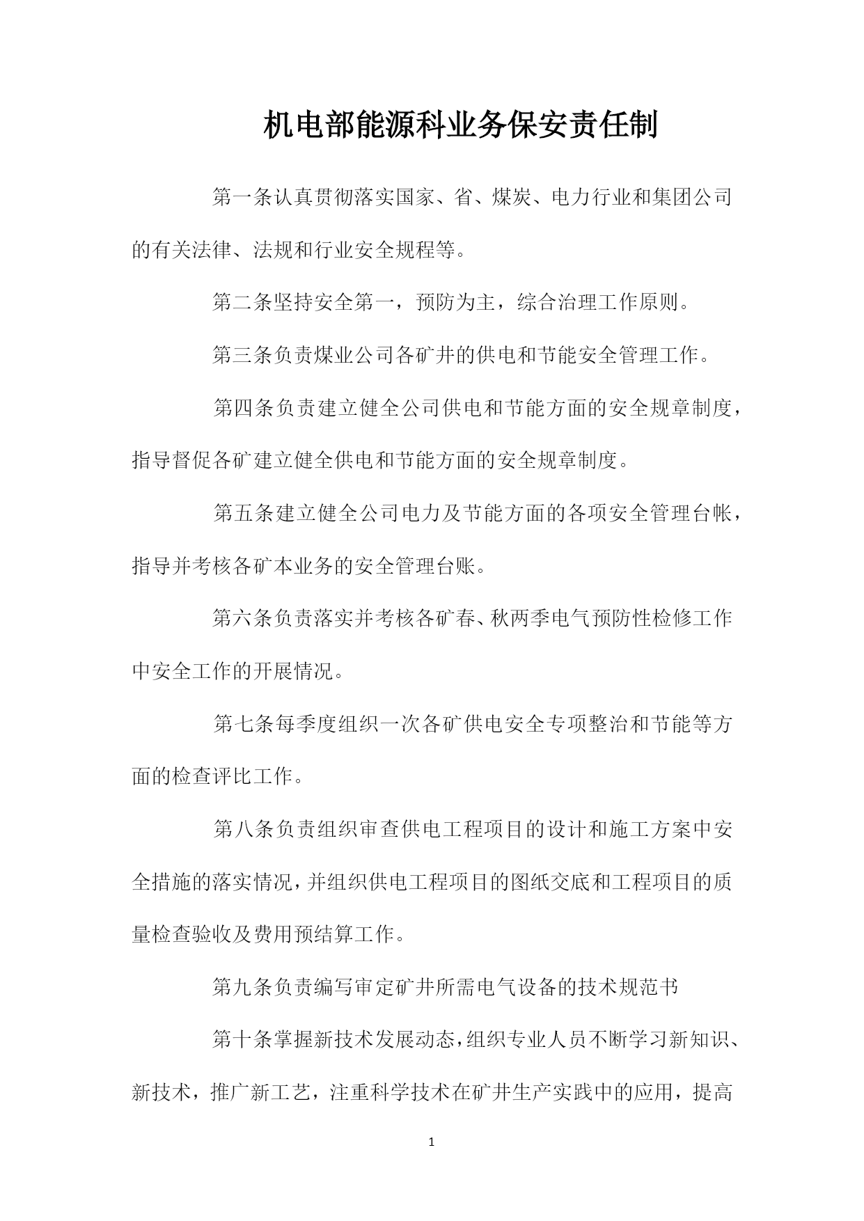 PAGEPAGE2机电部能源科业务保安责任制第一条认真贯彻落实国家、省、煤炭、电力行业和集团公司的有关法律、法规和行业安全规程等。第二条坚持安全第一,预防为主,综合治理工作原则。第三条负责煤业公司各矿井的供电和节能安全管理工作。第四条负责建立健全公司供电和节能方面的安全规章制度,指导督促各矿建立健全供电和节能方面的安全规章制度。第五条建立健全公司电力及节能方面的各项安全管理台帐,指导并考核各矿本业务的安全管理台账。第六条负责落实并考核各矿春、秋两季电气预防性检修工作中安全工作的开展情况。第七条