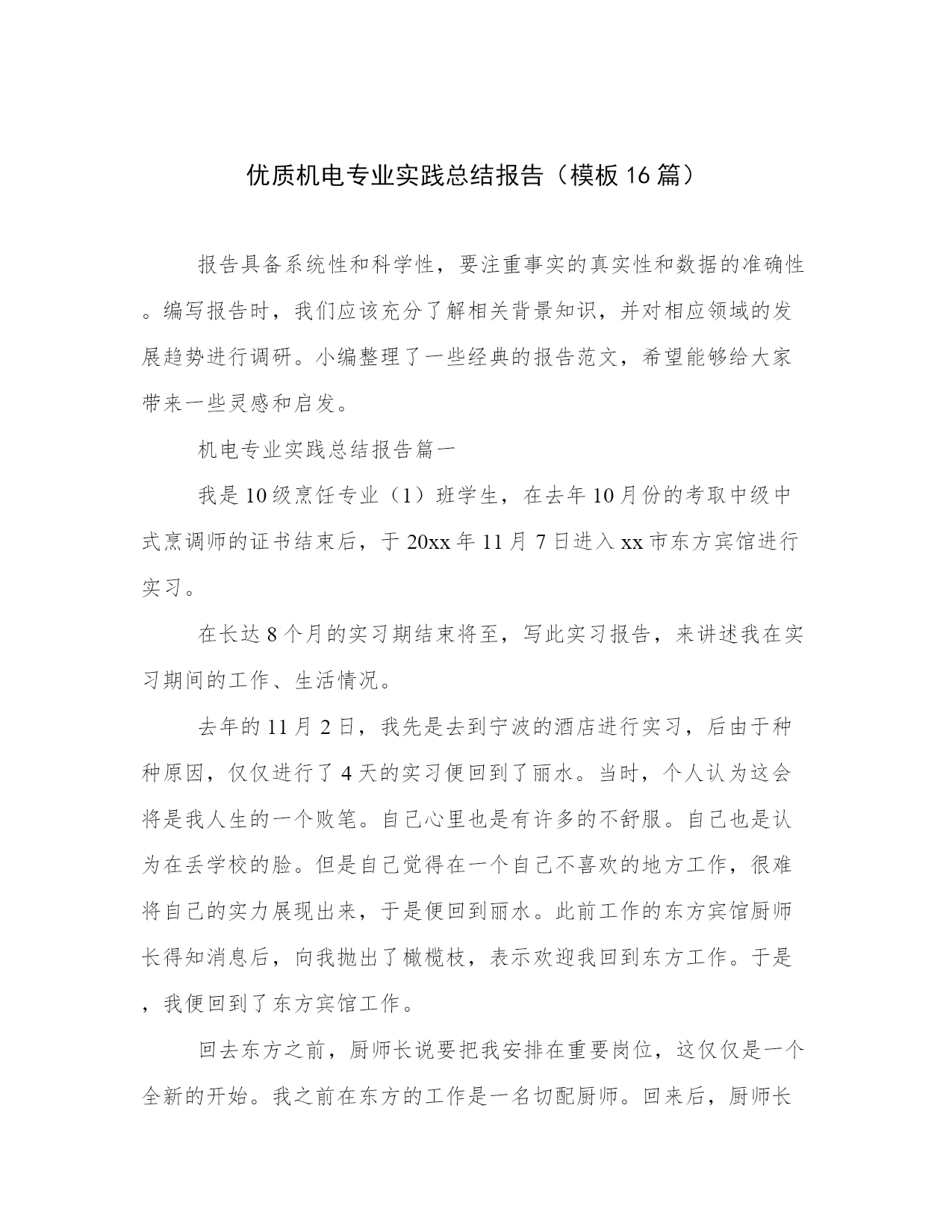 优质机电专业实践总结报告(模板16篇)报告具备系统性和科学性,要注重事实的真实性和数据的准确性。编写报告时,我们应该充分了解相关背景知识,并对相应领域的发展趋势进行调研。小编整理了一些经典的报告范文,希望能够给大家带来一些灵感和启发。机电专业实践总结报告篇一我是10级烹饪专业(1)班学生,在去年10月份的考取中级中式烹调师的证书结束后,于20xx年11月7日进入xx市东方宾馆进行实习。在长达8个月的实习期结束将至,写此实习报告,来讲述我在实习期间的工作、生活情况。去年的11月2日,我先是去到宁波的酒店进行