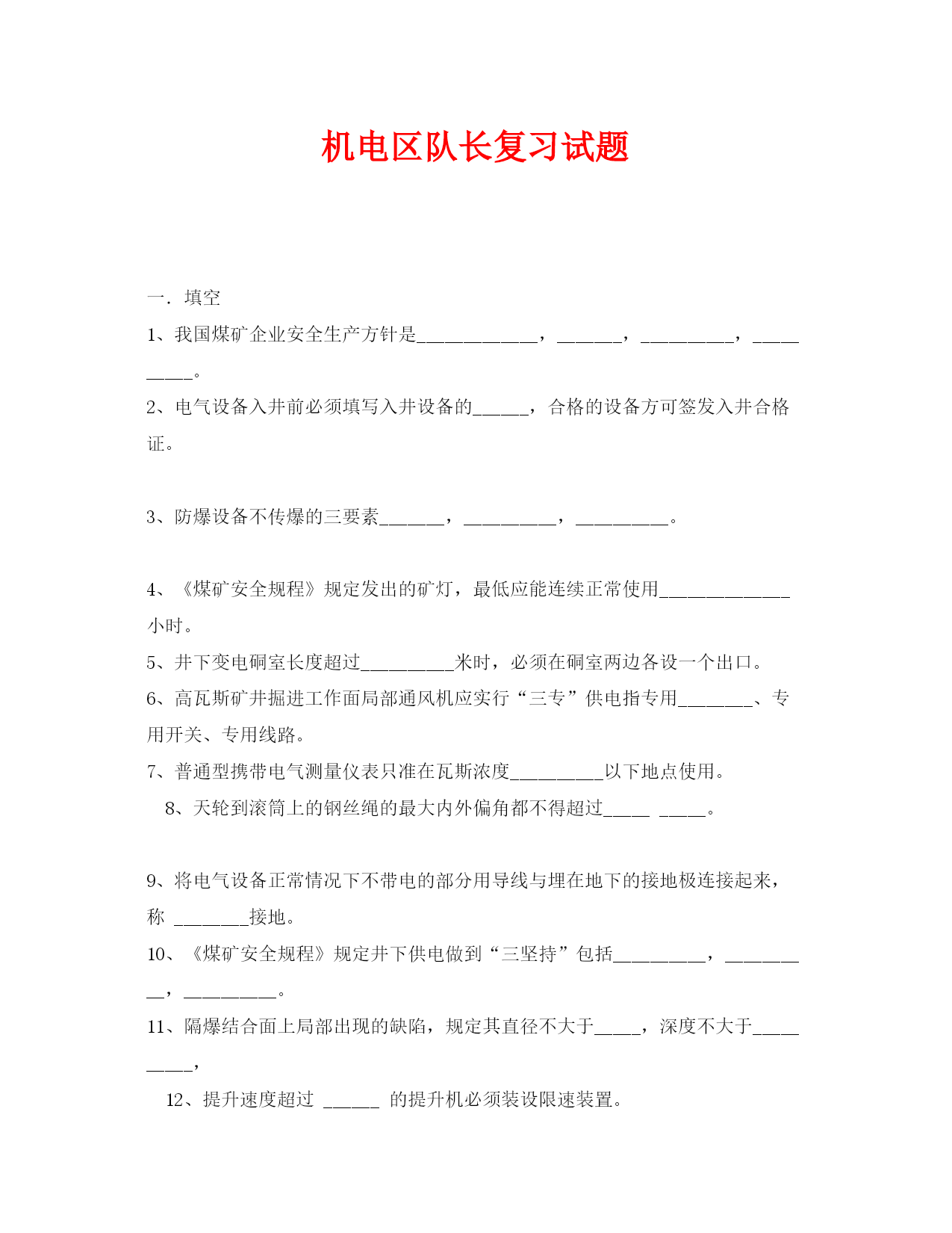此资料由网络收集而来,如有侵权请告知上传者立即删除。资料共分享,我们负责传递知识。机电区队长复习试题一.填空1、我国煤矿企业安全生产方针是_____________,_______,__________,__________。2、电气设备入井前必须填写入井设备的______,合格的设备方可签发入井合格证。3、防爆设备不传爆的三要素_______,__________,__________。4、《煤矿安全规程》规定发出的矿灯,最低应能连续正常使用______________小时。5、井下变电硐室长度超过__