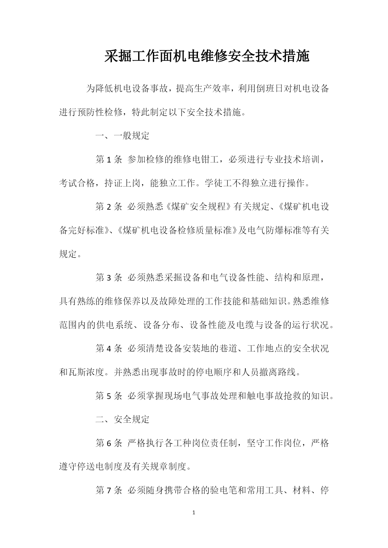 PAGEPAGE3采掘工作面机电维修安全技术措施为降低机电设备事故,提高生产效率,利用倒班日对机电设备进行预防性检修,特此制定以下安全技术措施。一、一般规定第1条参加检修的维修电钳工,必须进行专业技术培训,考试合格,持证上岗,能独立工作。学徒工不得独立进行操作。第2条必须熟悉《煤矿安全规程》有关规定、《煤矿机电设备完好标准》、《煤矿机电设备检修质量标准》及电气防爆标准等有关规定。第3条必须熟悉采掘设备和电气设备性能、结构和原理,具有熟练的维修保养以及故障处理的工作技能和基础知识。熟悉维修范围内