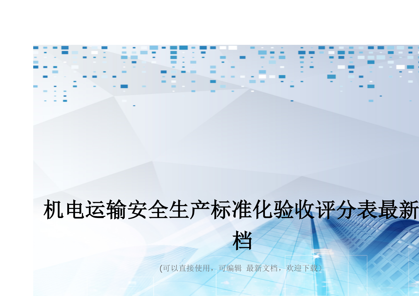 机电运输安全生产标准化验收评分表最新文档(可以直接使用,可编辑最新文档,欢迎下载)煤矿机电安全生产标准化评分表检查单位:专业得分:评定等级:检查时间:检查人:项目项目内容基本要求标准分值评分方法扣分原因得分一、设备与指标(15分)设备证标1.机电设备有产品合格证;2.纳入安标管理的产品有煤矿矿用产品安全标志,使用地点符合规定;3.防爆设备有防爆合格证4查现场和资料。1台不符合要求不得分设备完好机电设备综合完好率不低于90%3查现场和资料。每降低1个百分点扣0.5分固定设备大型在用固定设备完好2查现场和资料