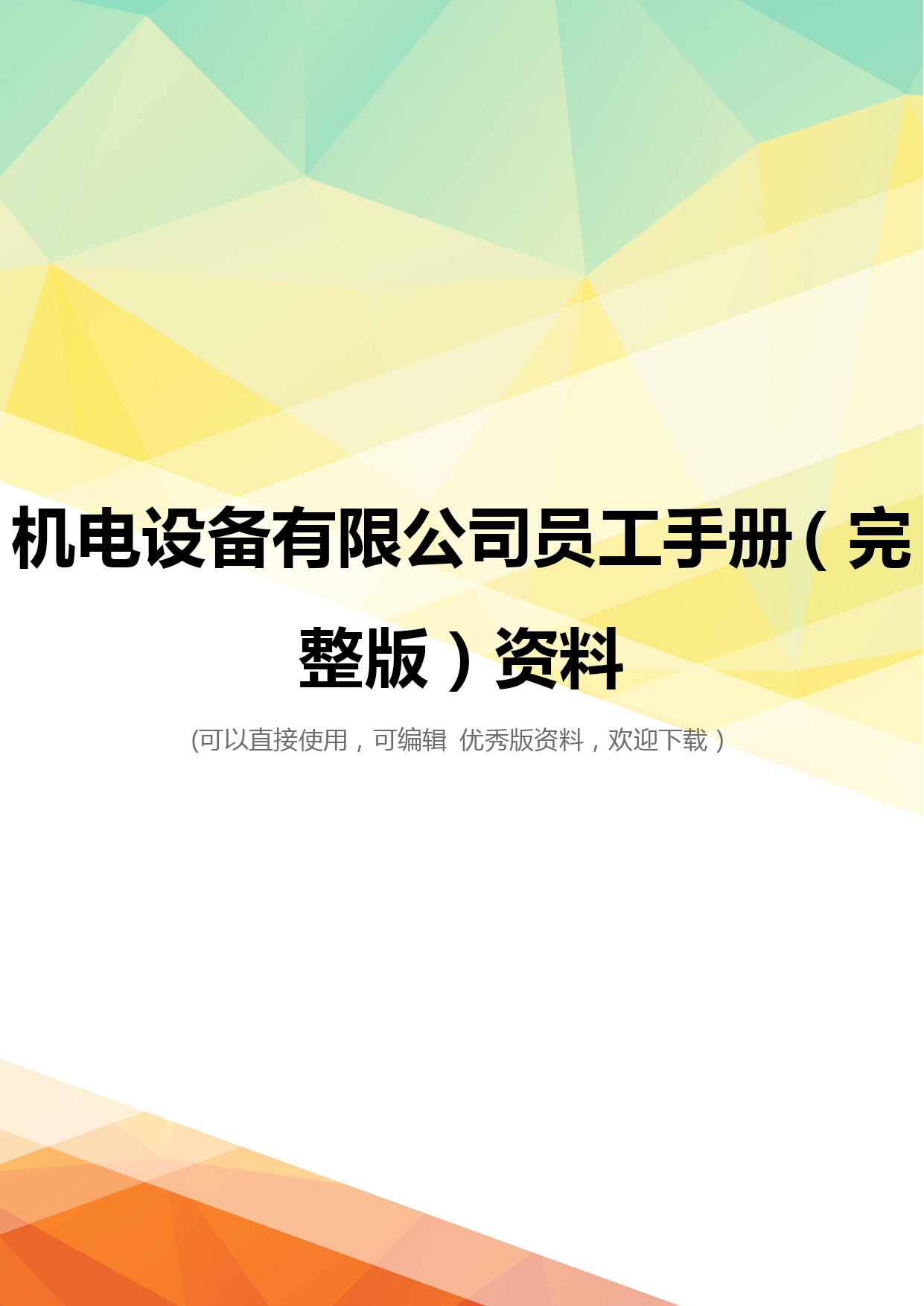 机电设备有限公司员工手册(完整版)资料(可以直接使用,可编辑优秀版资料,欢迎下载)员工手册致新员工书欢迎您加入xx市xx机电设备的大家庭!本员工手册旨在帮助您了解新的工作环境,从而使您尽快与公司融为一体。本手册让您了解xx公司的组织结构、管理哲学和公司价值等有关情况,帮助您理解就职于xx公司的各项条件及要求。本手册还可以使您了解公司的方针政策和全体员工必须遵守的各种规章制度。本手册只是指南。如对手册所述的方针政策和规章制度有任何疑问,请与部门主管或行政部联系。祝愿您在xx公司工作事业有成!总经理:目录T