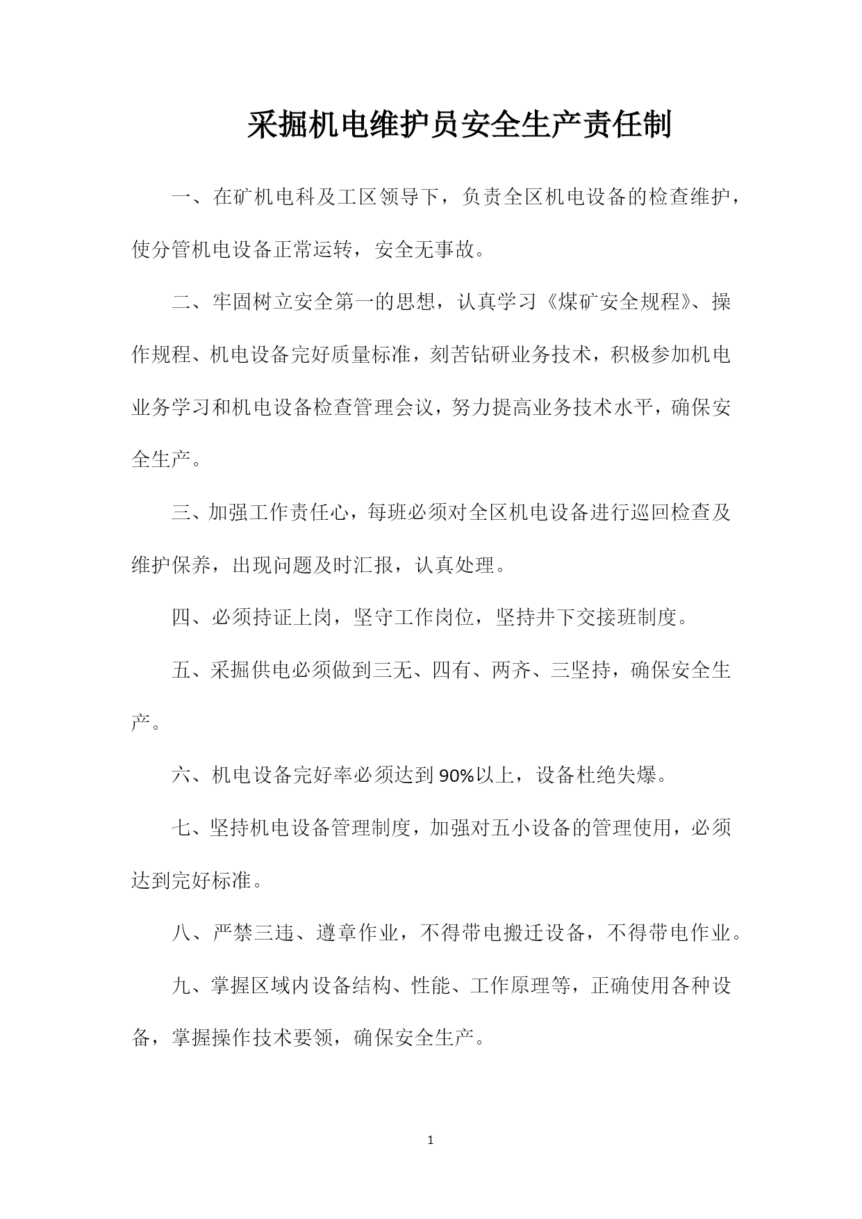 PAGEPAGE2采掘机电维护员安全生产责任制一、在矿机电科及工区领导下,负责全区机电设备的检查维护,使分管机电设备正常运转,安全无事故。二、牢固树立安全第一的思想,认真学习《煤矿安全规程》、操作规程、机电设备完好质量标准,刻苦钻研业务技术,积极参加机电业务学习和机电设备检查管理会议,努力提高业务技术水平,确保安全生产。三、加强工作责任心,每班必须对全区机电设备进行巡回检查及维护保养,出现问题及时汇报,认真处理。四、必须持证上岗,坚守工作岗位,坚持井下交接班制度。五、采掘供电必须做到三无、四有