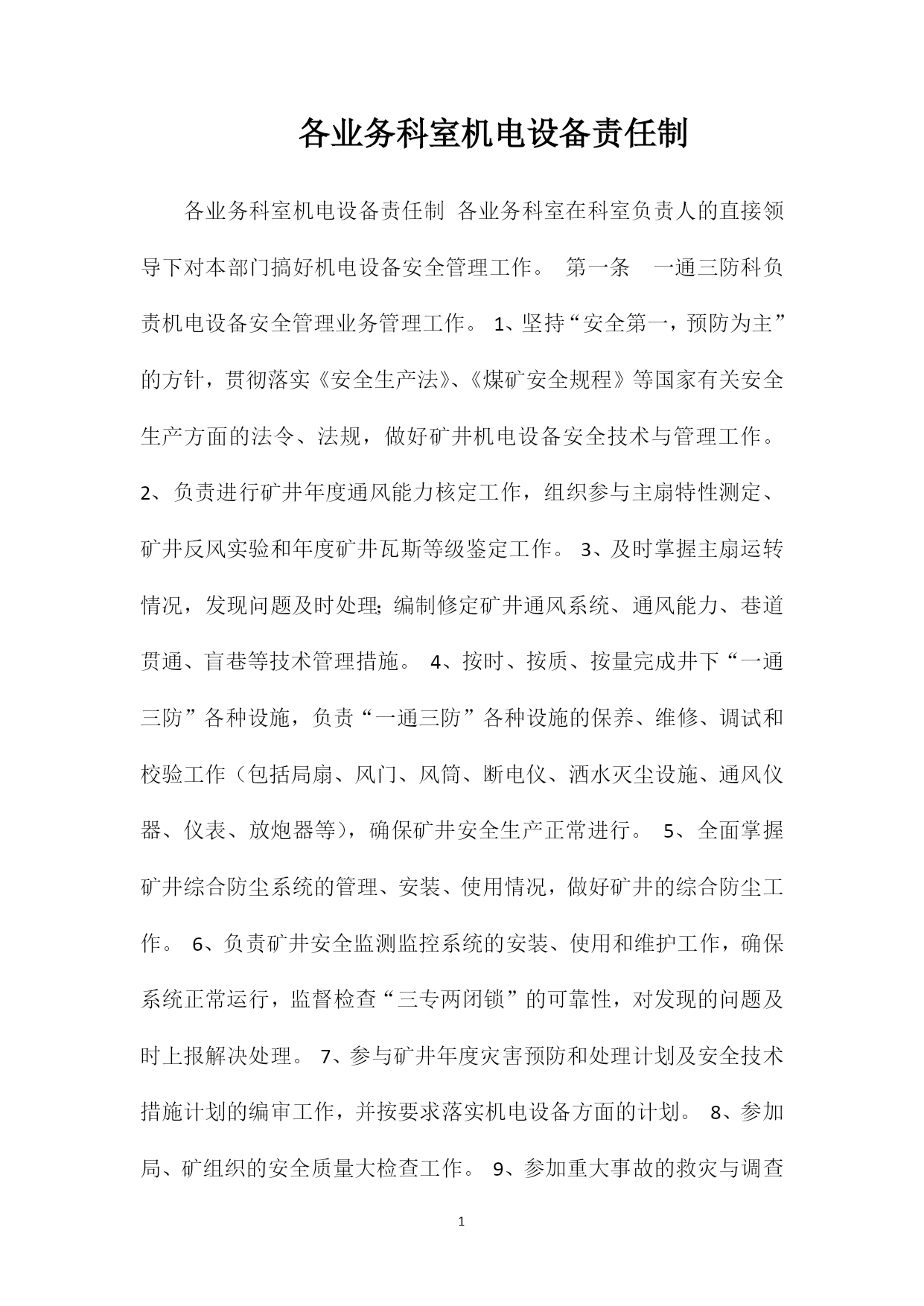 PAGEPAGE4各业务科室机电设备责任制各业务科室机电设备责任制各业务科室在科室负责人的直接领导下对本部门搞好机电设备安全管理工作。第一条一通三防科负责机电设备安全管理业务管理工作。1、坚持“安全第一,预防为主”的方针,贯彻落实《安全生产法》、《煤矿安全规程》等国家有关安全生产方面的法令、法规,做好矿井机电设备安全技术与管理工作。2、负责进行矿井年度通风能力核定工作,组织参与主扇特性测定、矿井反风实验和年度矿井瓦斯等级鉴定工作。3、及时掌握主扇运转情况,发现问题及时处理;编制修定矿井通风系统