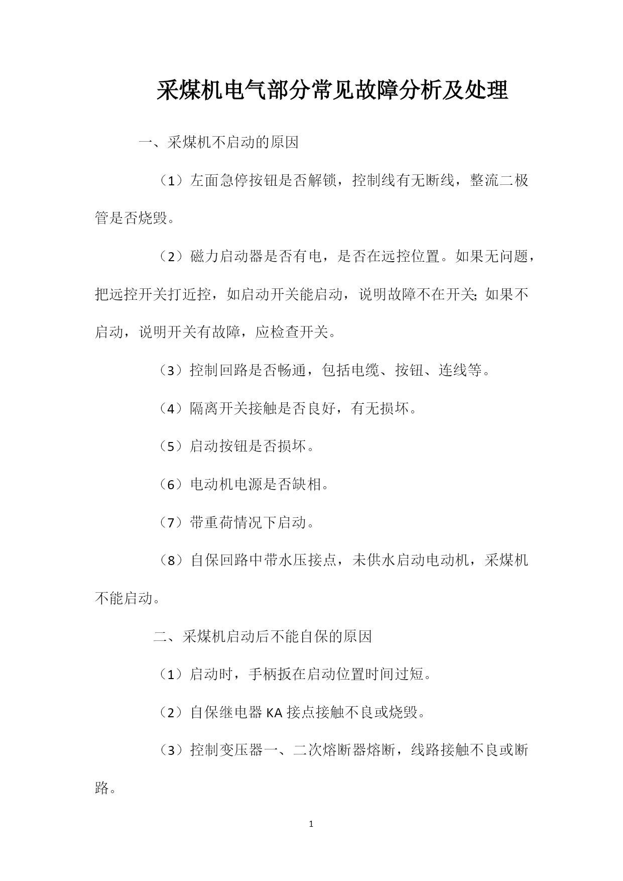 PAGEPAGE2采煤机电气部分常见故障分析及处理一、采煤机不启动的原因(1)左面急停按钮是否解锁,控制线有无断线,整流二极管是否烧毁。(2)磁力启动器是否有电,是否在远控位置。如果无问题,把远控开关打近控,如启动开关能启动,说明故障不在开关;如果不启动,说明开关有故障,应检查开关。(3)控制回路是否畅通,包括电缆、按钮、连线等。(4)隔离开关接触是否良好,有无损坏。(5)启动按钮是否损坏。(6)电动机电源是否缺相。(7)带重荷情况下启动。(8)自保回路中带水压接点,未供水启动电动机,采煤机不