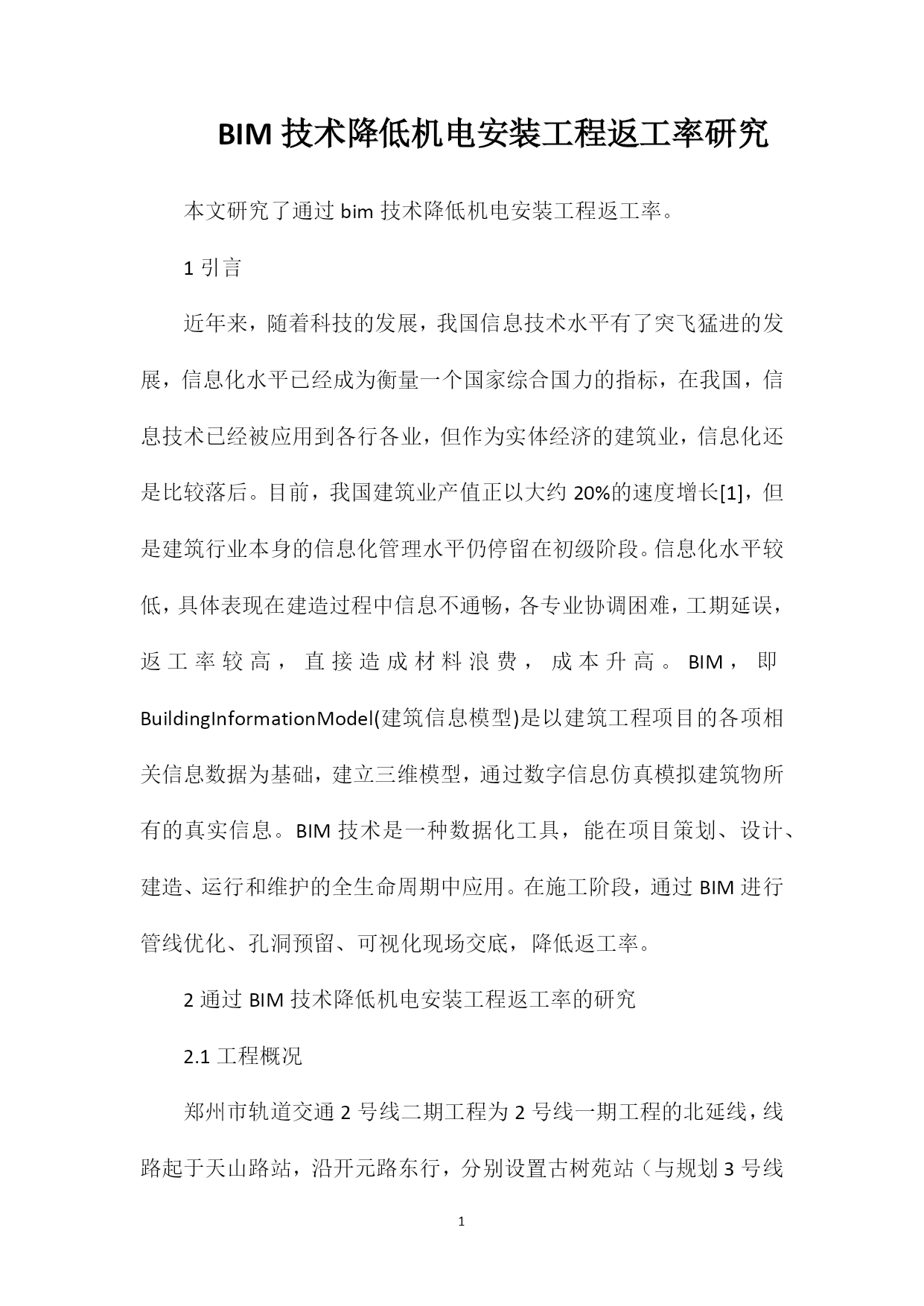 PAGEPAGE5BIM技术降低机电安装工程返工率研究本文研究了通过bim技术降低机电安装工程返工率。1引言近年来,随着科技的发展,我国信息技术水平有了突飞猛进的发展,信息化水平已经成为衡量一个国家综合国力的指标,在我国,信息技术已经被应用到各行各业,但作为实体经济的建筑业,信息化还是比较落后。目前,我国建筑业产值正以大约20%的速度增长[1],但是建筑行业本身的信息化管理水平仍停留在初级阶段。信息化水平较低,具体表现在建造过程中信息不通畅,各专业协调困难,工期延误,返工率较高,直接造成材料浪