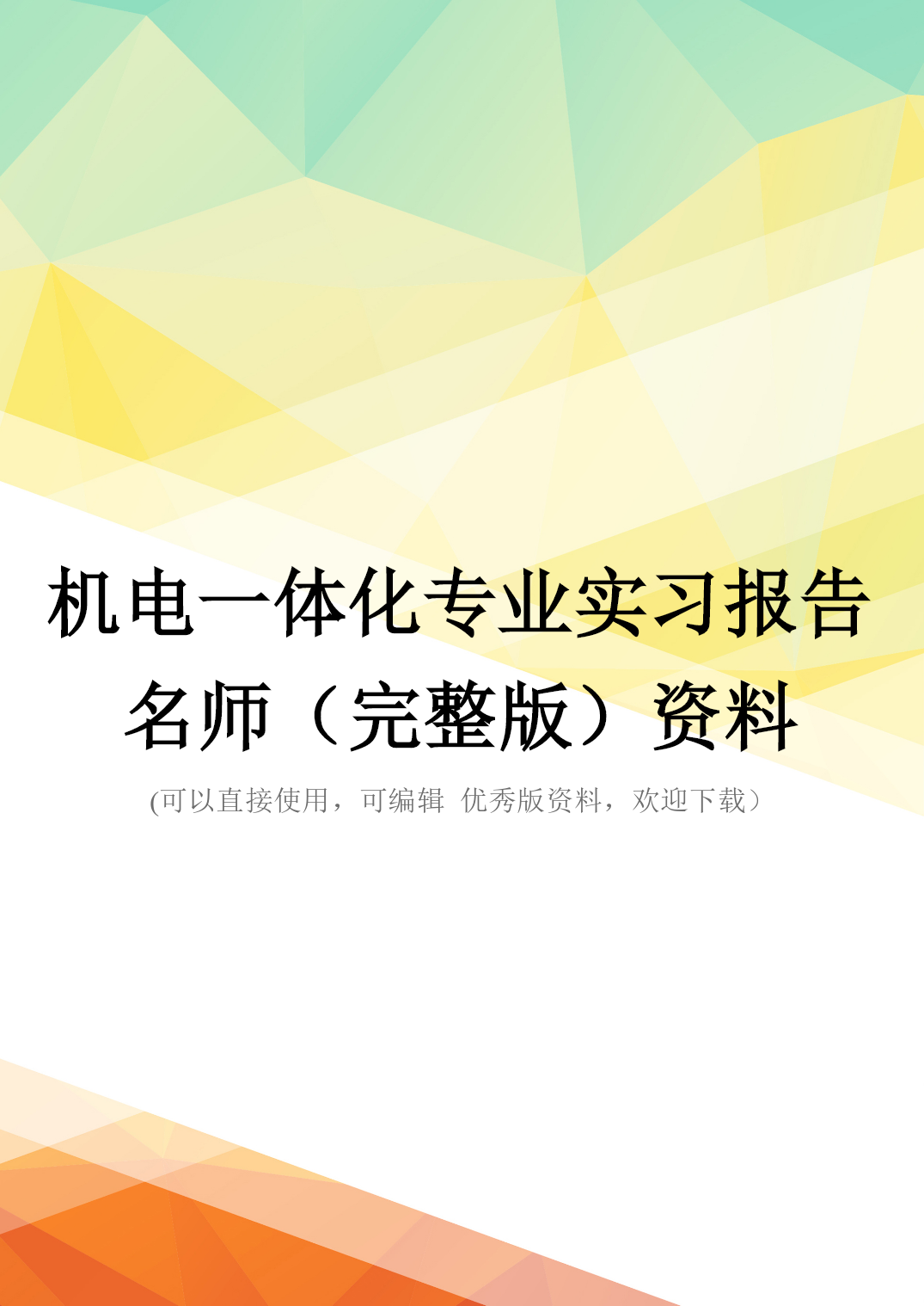 机电一体化专业实习报告名师(完整版)资料(可以直接使用,可编辑优秀版资料,欢迎下载)专科毕业实习报告学生XX学习中心XXXXXXXXX专业XXXXXXX层次高起专提交日期年月日机电一体化专业实习报告实习目的:在校大学生常听人说“理论与实践相结合”,“用理论来指导实践,在实践中升华理论”。而真正参与到社会的实践中我才懂了这几句话的内涵。毕业实习是理论与实践相结合的重要方式,学生通过实习走向社会使学生初步掌握各种岗位的基本生产操作技能,具备简单故障的处理和设备的维护能力,初步认识和了解煤矿环境、生产系统,了解