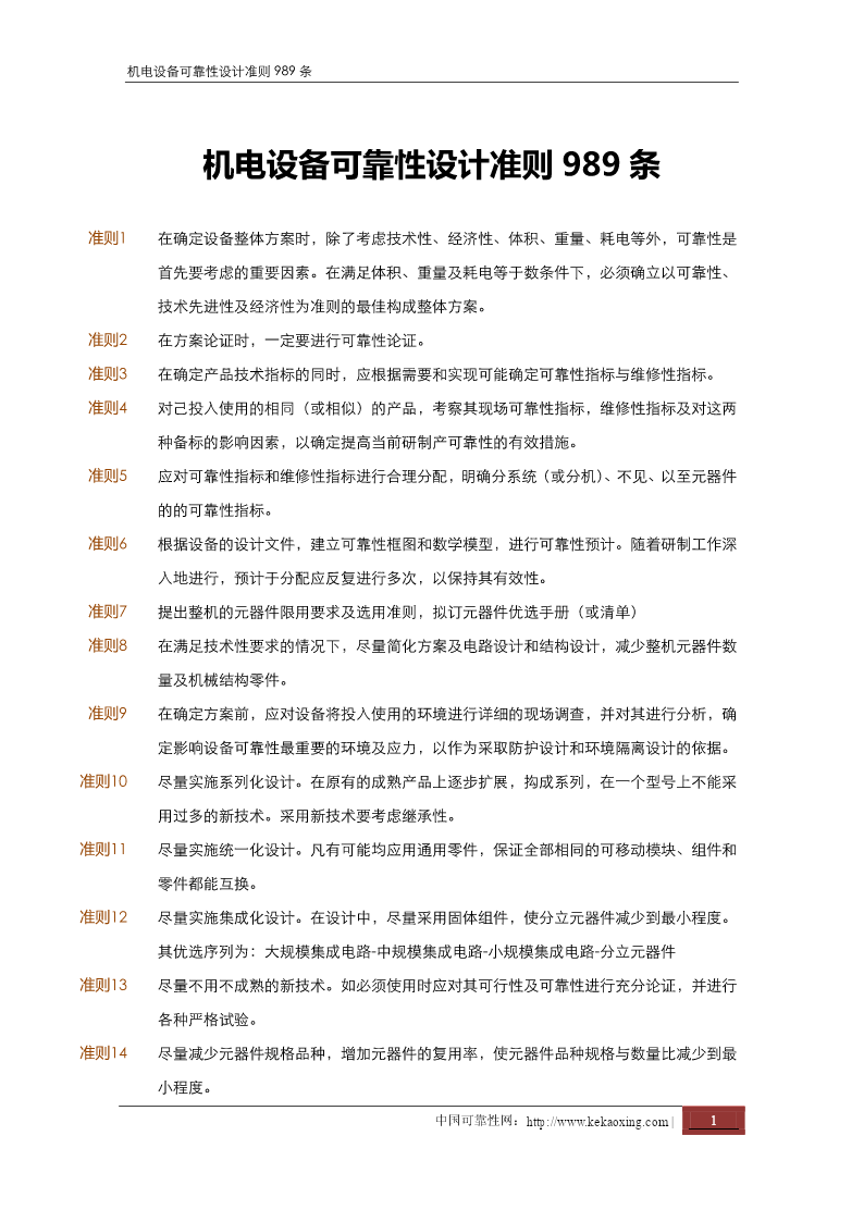 机电设备可靠性设计准则989条机电设备可靠性设计准则989条准则1在确定设备整体方案时,除了考虑技术性、经济性、体积、重量、耗电等外,可靠性是首先要考虑的重要因素。在满足体积、重量及耗电等于数条件下,必须确立以可靠性、技术先进性及经济性为准则的最佳构成整体方案。准则2在方案论证时,一定要进行可靠性论证。准则3在确定产品技术指标的同时,应根据需要和实现可能确定可靠性指标与维修性指标。准则4对己投入使用的相同(或相似)的产品,考察其现场可靠性指标,维修性指标及对这两种备标的影响因素,以确定提高当前研制产可靠性