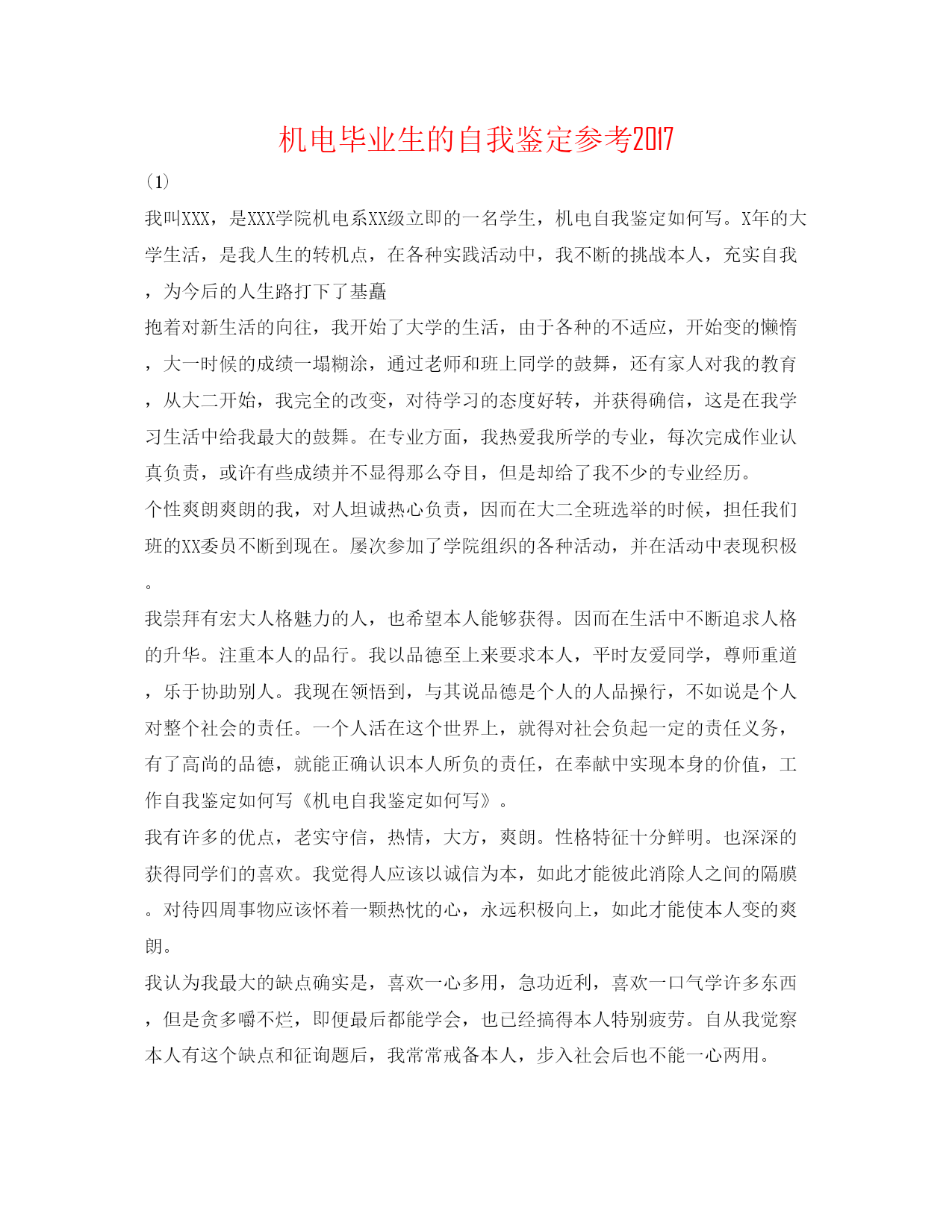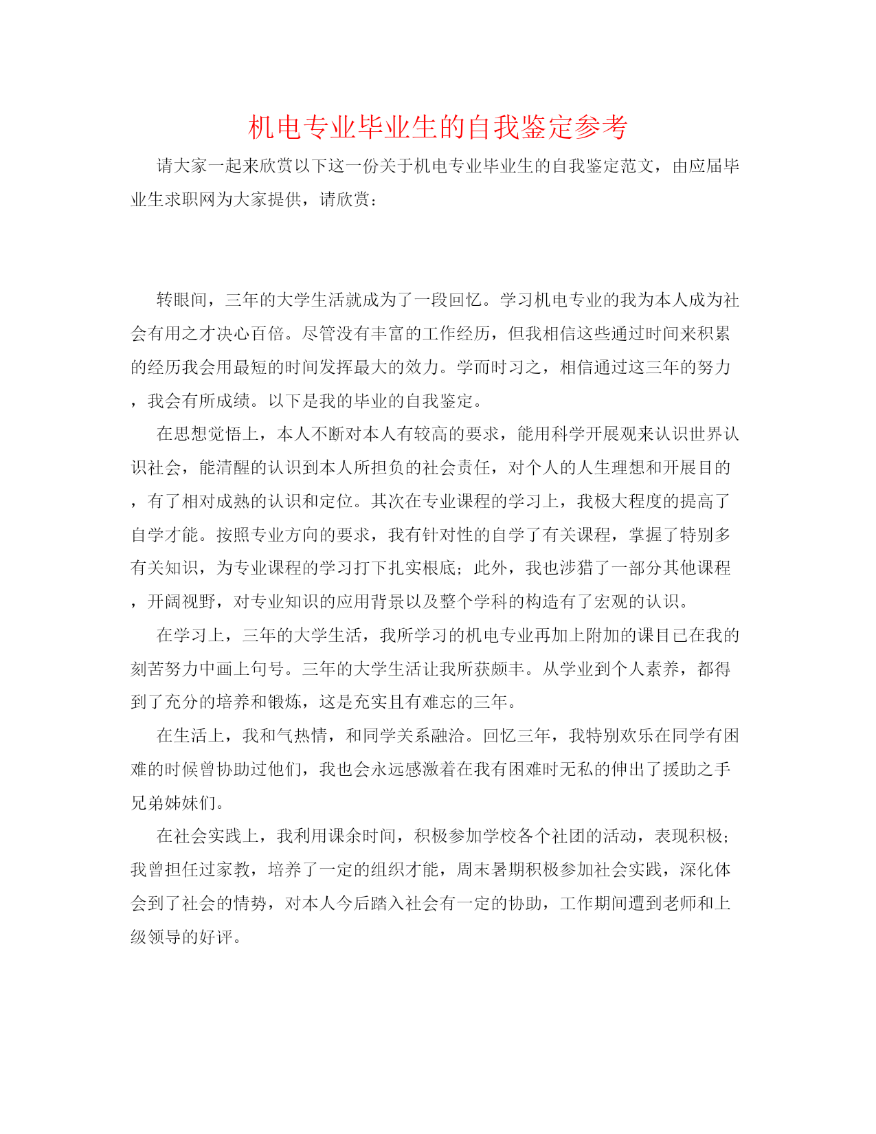 机电专业毕业生的自我鉴定参考请大家一起来欣赏以下这一份关于机电专业毕业生的自我鉴定范文,由应届毕业生求职网为大家提供,请欣赏:转眼间,三年的大学生活就成为了一段回忆。学习机电专业的我为本人成为社会有用之才决心百倍。尽管没有丰富的工作经历,但我相信这些通过时间来积累的经历我会用最短的时间发挥最大的效力。学而时习之,相信通过这三年的努力,我会有所成绩。以下是我的毕业的自我鉴定。在思想觉悟上,本人不断对本人有较高的要求,能用科学开展观来认识世界认识社会,能清醒的认识到本人所担负的社会责任,对个人的人生理想和开展
