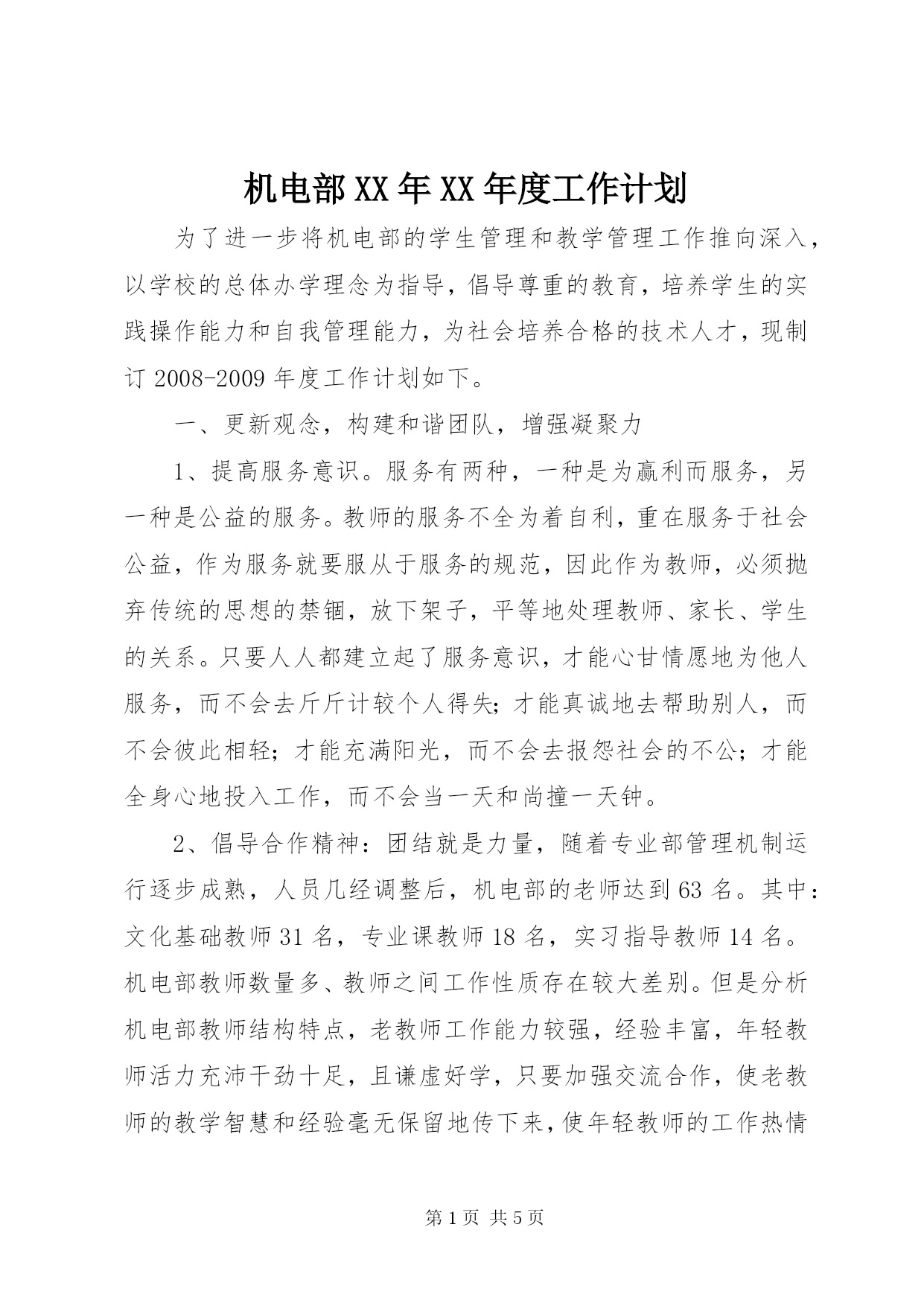 第PAGE\*Arabic\*MERGEFORMAT5页共NUMPAGES\*MERGEFORMAT5页机电部XX年XX年度工作计划为了进一步将机电部的学生管理和教学管理工作推向深入,以学校的总体办学理念为指导,倡导尊重的教育,培养学生的实践操作能力和自我管理能力,为社会培养合格的技术人才,现制订2008-2009年度工作计划如下。一、更新观念,构建和谐团队,增强凝聚力1、提高服务意识。服务有两种,一种是为赢利而服务,另一种是公益的服务。教师的服务不全为着自利,重在服务于社会公益,作为服务就要