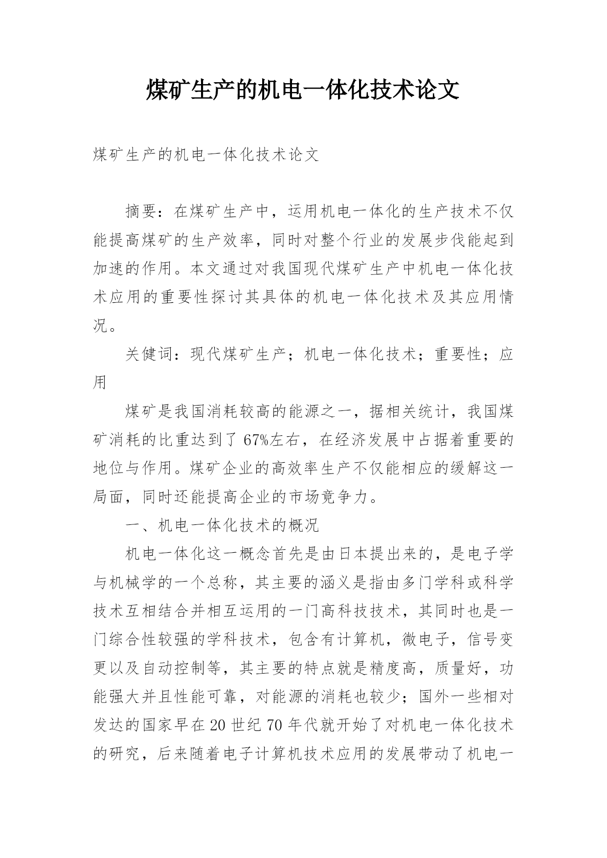 煤矿生产的机电一体化技术论文煤矿生产的机电一体化技术论文摘要:在煤矿生产中,运用机电一体化的生产技术不仅能提高煤矿的生产效率,同时对整个行业的发展步伐能起到加速的作用。本文通过对我国现代煤矿生产中机电一体化技术应用的重要性探讨其具体的机电一体化技术及其应用情况。关健词:现代煤矿生产;机电一体化技术;重要性;应用煤矿是我国消耗较高的能源之一,据相关统计,我国煤矿消耗的比重达到了67%左右,在经济发展中占据着重要的地位与作用。煤矿企业的高效率生产不仅能相应的缓解这一局面,同时还能提高企业的市场竟争力。一、机电