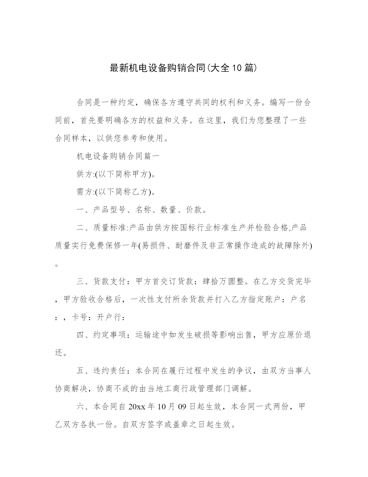 最新机电设备购销合同(大全10篇)合同是一种约定,确保各方遵守共同的权利和义务。编写一份合同前,首先要明确各方的权益和义务。在这里,我们为您整理了一些合同样本,以供您参考和使用。机电设备购销合同篇一供方:(以下简称甲方)。需方:(以下简称乙方)。一、产品型号、名称、数量、价款。二、质量标准:产品由供方按国标行业标准生产并检验合格,产品质量实行免费保修一年(易损件、耐磨件及非正常操作造成的故障除外)。三、货款支付:甲方首交订货款:肆拾万圆整。在乙方交货完毕,甲方验收合格后,一次性支付所余货款并打入乙方指定账