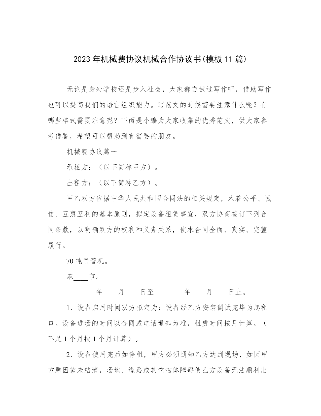 2023年机械费协议机械合作协议书(模板11篇).docx