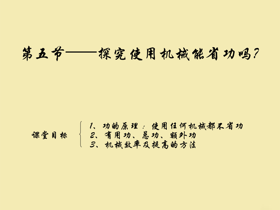 第五节——探究使用机械能省功吗?为什么使用动滑轮不省功呢?一、功的原理:五、提高机械效率方法:精炼题:2、一物体较重,我们直接搬上车很难,我们一般会搭一个板子,成一个斜面,这样利用这个机械——斜面,就可以轻松搬上车。所以斜面是一个机械。(省力或费力)4、工人用一动滑轮,将质量为20kg的货物匀速竖直提高2m,已知该动滑轮的机械效率为80%,球工人的拉力。